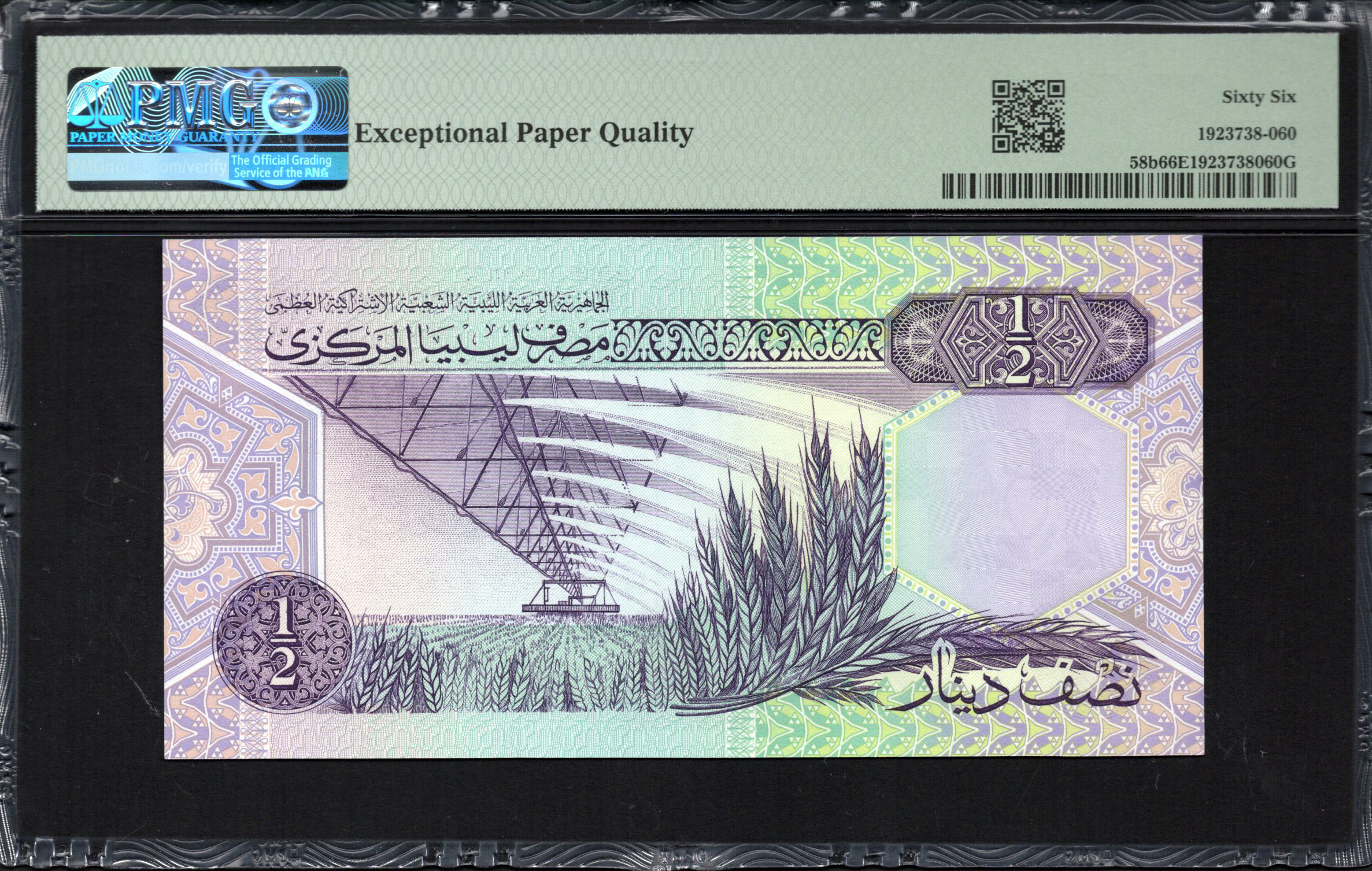 The front of the banknote presents a stunning array of colors, predominantly featuring hues of blue and green. It showcases a geometric pattern that is typical in Islamic art, enhancing its aesthetic appeal. A depiction of modern architecture, likely representing Libya's industrial progress, emphasizes the nation’s development. Security features such as a watermark of the central emblem and microprinting are subtly integrated into the design, reinforcing the note's integrity against counterfeiting. The denomination '1/2 Dinar' is clearly visible, along with a serial number that enhances its individuality.