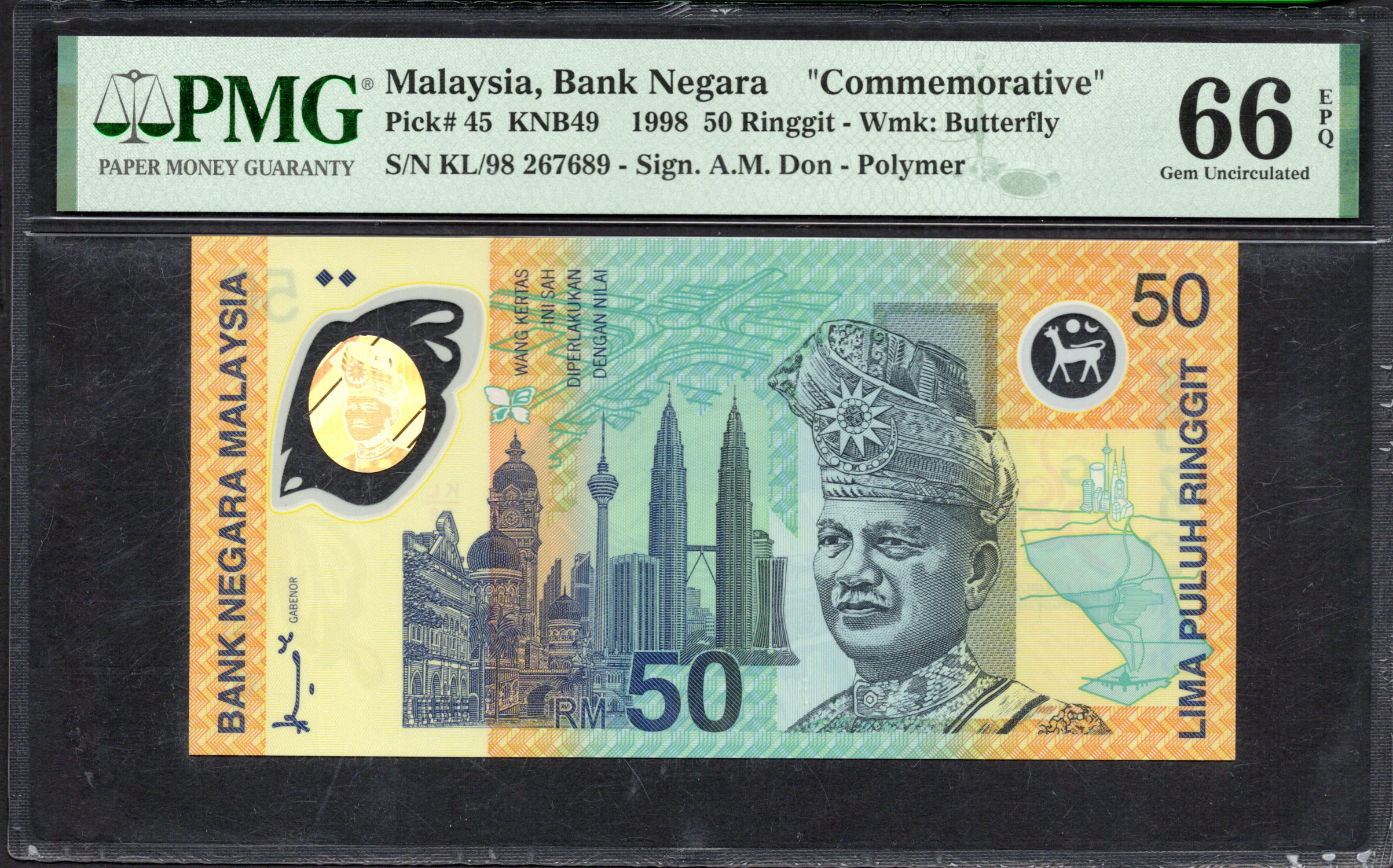 This analysis covers the 50 Ringgit banknote from Malaysia, issued in 1998 as a commemorative piece. The note showcases vibrant colors and intricate designs, reflecting Malaysia's cultural heritage and modern achievements. The front features notable landmarks such as the Petronas Towers, traditional motifs, and a portrait that symbolizes national pride. The back depicts various elements that enhance the banknote's security and visual appeal, making it a significant collectible item.