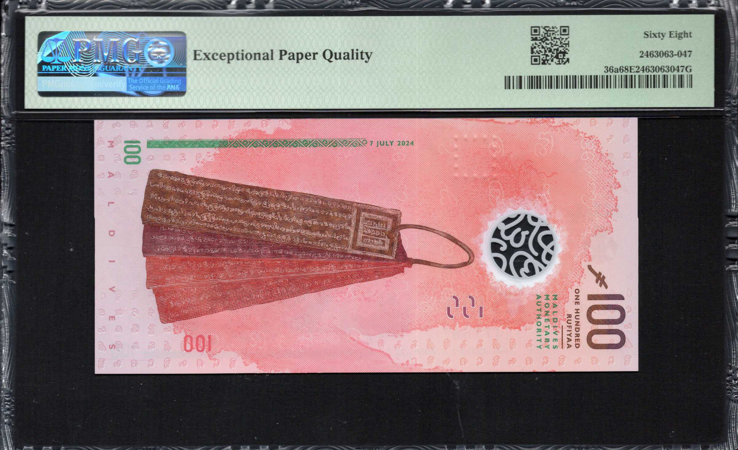 The 100 Rufiyaa banknote from the Maldives showcases rich cultural symbolism and intricate design elements. Dominating the front is a vibrant red hue that reflects the island nation's identity. The design features a blend of traditional and contemporary elements, highlighting the diverse heritage of the Maldives. Artistically, the banknote integrates illustrations of local artisans and designs that speak to the national culture. On the reverse side, important symbols, such as the national emblem, underscore the pride and history of the Maldives. The polymer material of the banknote contributes additional security features while maintaining durability.