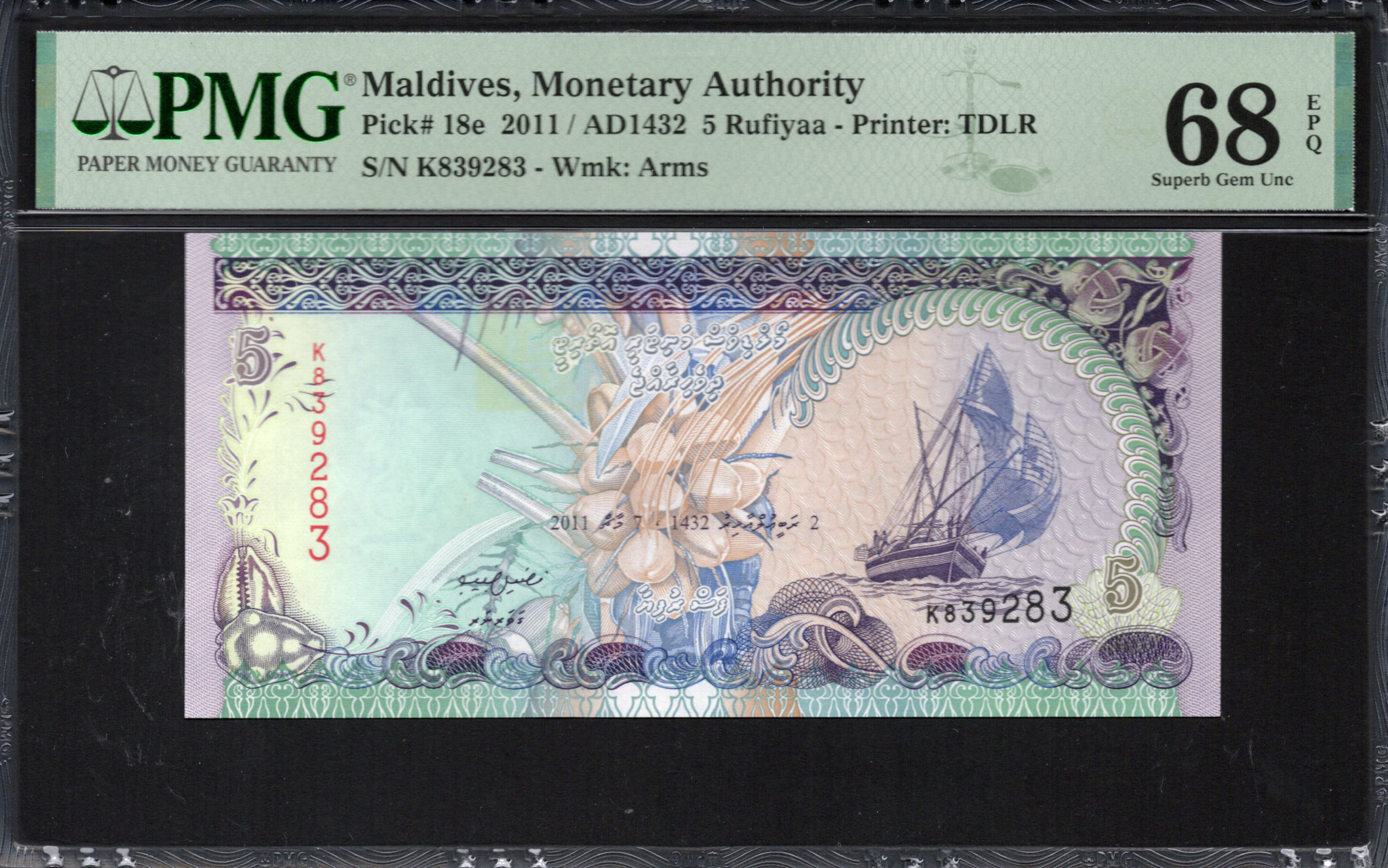 This 5 Maldivian Rufiyaa banknote showcases intricate designs and notable security features. It highlights a sailing ship, symbolizing the Maldives' rich maritime heritage. The use of vibrant colors such as green and purple enhances its visual appeal, while the detailed patterns reflect traditional Maldivian art. The note's back features additional ornamentation, making it not just a means of transaction but a piece of cultural representation.