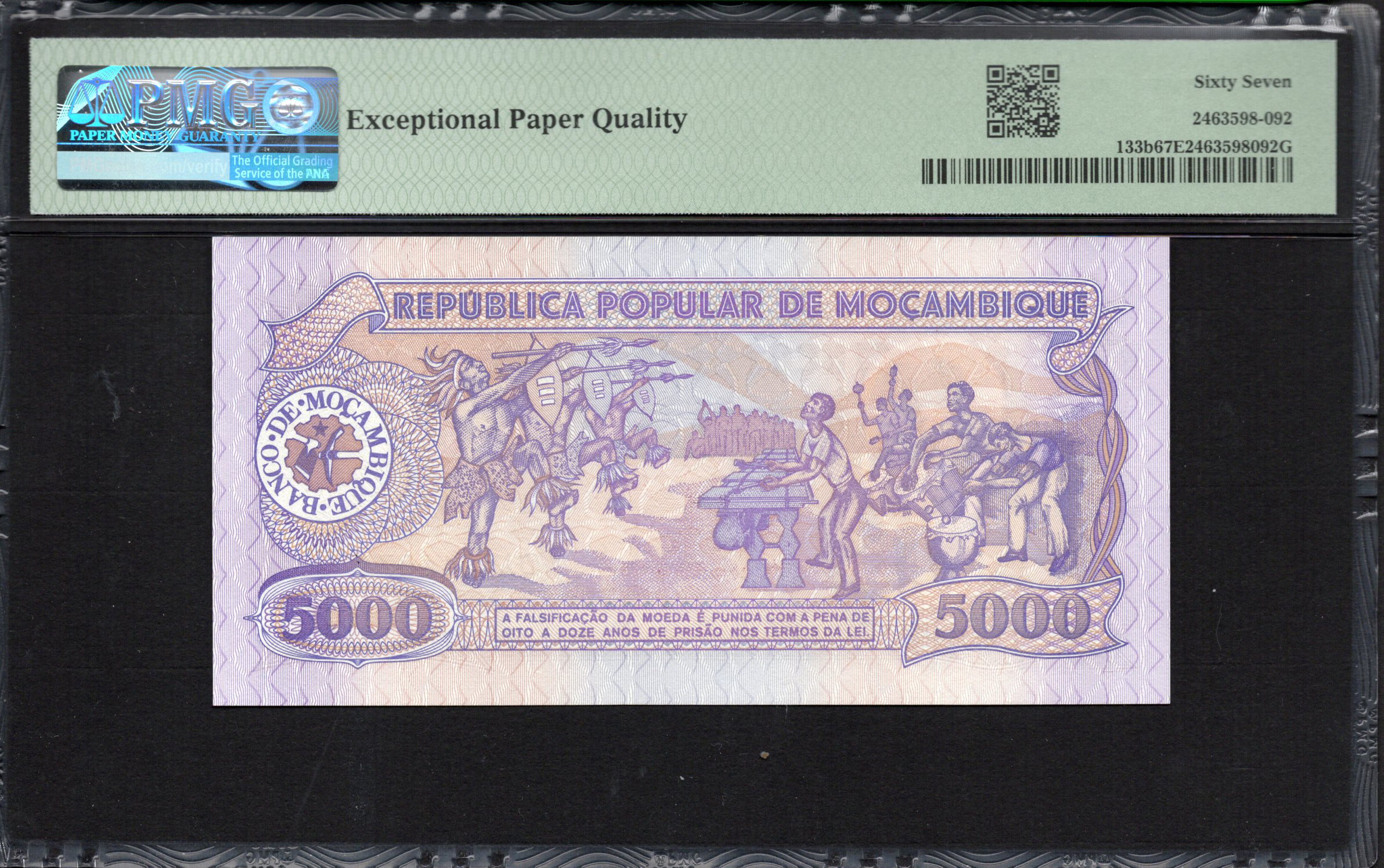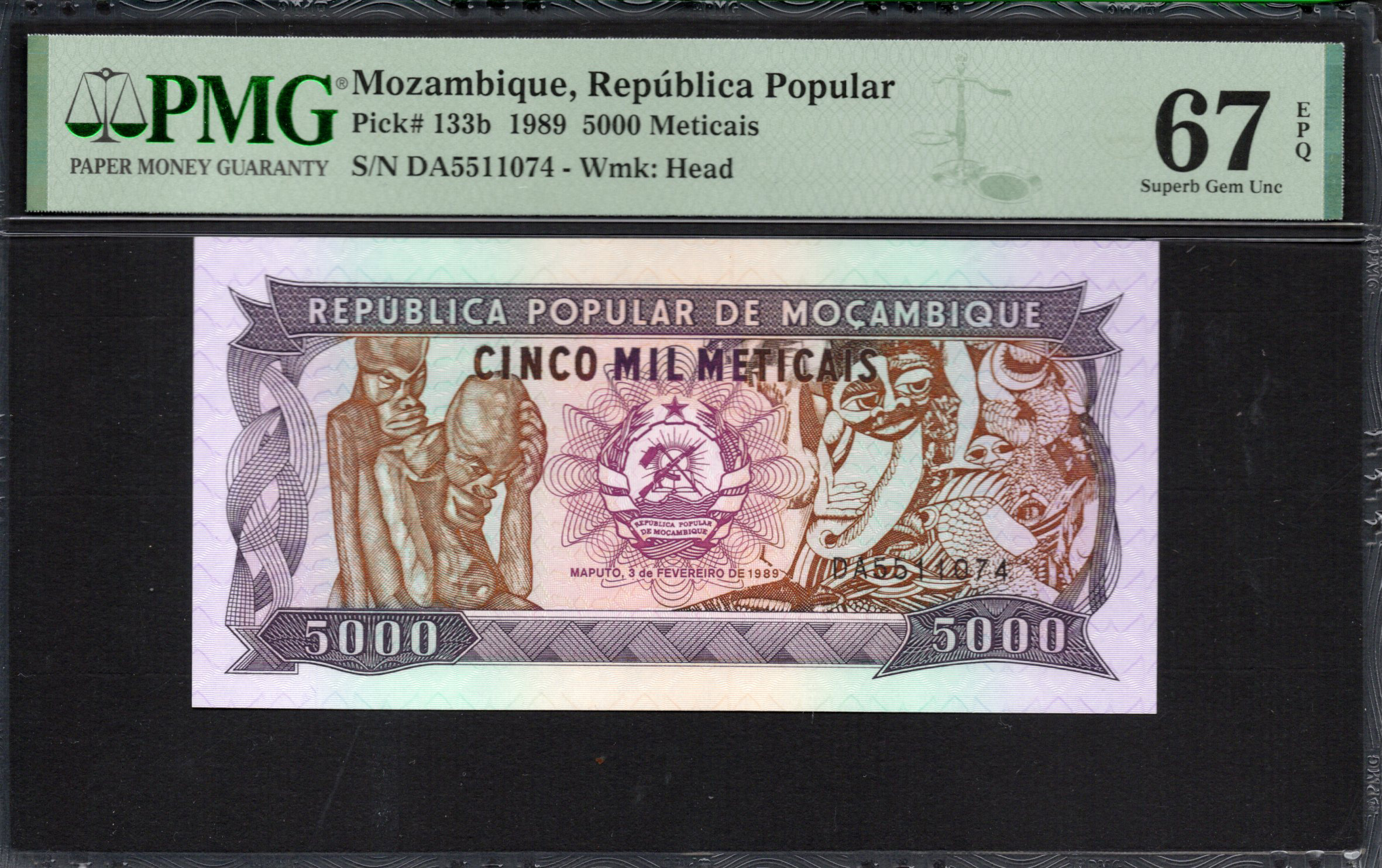 The banknote from Mozambique, issued in 1989, showcases both cultural significance and intricate design. The denomination of 5000 Meticais features vibrant colors and striking artistic elements that illustrate the nation's heritage. This note is a great example of the fusion of functionality and artistry in currency design. The front highlights human figures symbolizing unity, while the back presents local wildlife and abstract patterns, reflecting the country's natural beauty and diversity. Security features like watermarks enhance its authenticity, making it a valuable piece for both collectors and those interested in local culture.