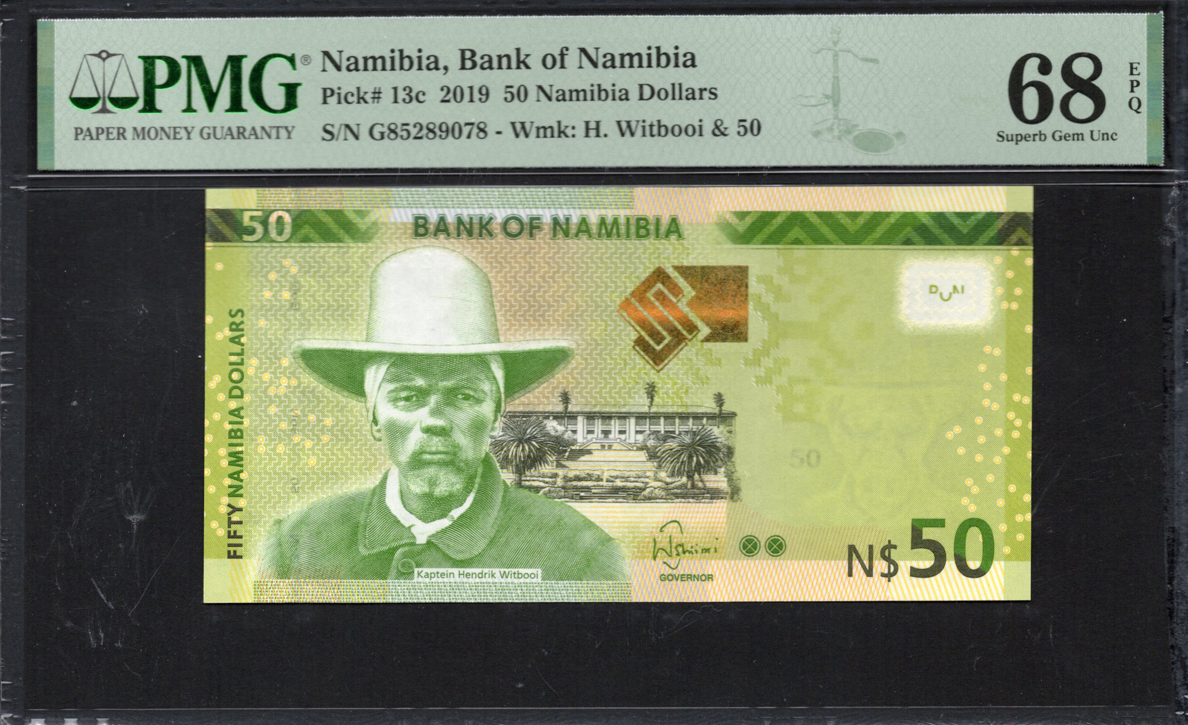 The front of the 50 Namibian Dollar note prominently displays a detailed portrait of Kaptein Hendrik Witbooi, accentuated by a traditional hat. Surrounding the portrait is a gradient of green hues with ornamental patterns, adding to the visual appeal. The text highlights the denomination and the bank's name, while notable security elements include a watermarked image of Witbooi and micro-printing, which are designed to deter counterfeiting. Subtle design elements such as the golden patterns in the background contribute to the aesthetic value.