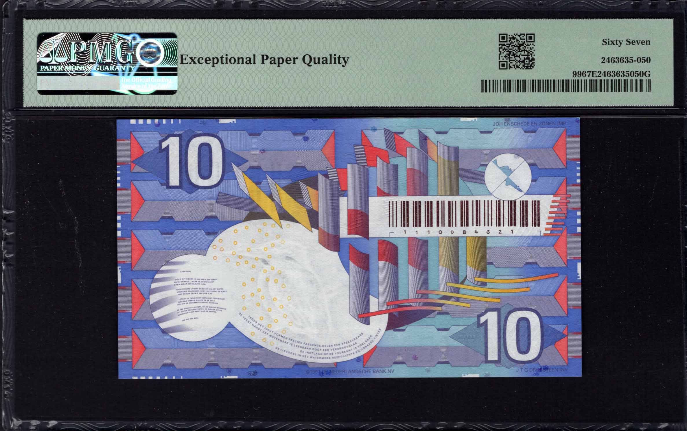 This Dutch 10-guilder banknote, issued by De Nederlandsche Bank in 1997, showcases vibrant colors and intricate designs that reflect the innovative spirit of the Netherlands. The front features an abstract depiction of a bird as its watermarkâa nod to the natural elements of Dutch culture. Various geometric patterns in shades of blue, purple, and orange create a visually striking composition, while the prominent '10' clearly indicates its denomination. This note not only serves as currency but also as a piece of art, embodying the blend of functionality and aesthetics.