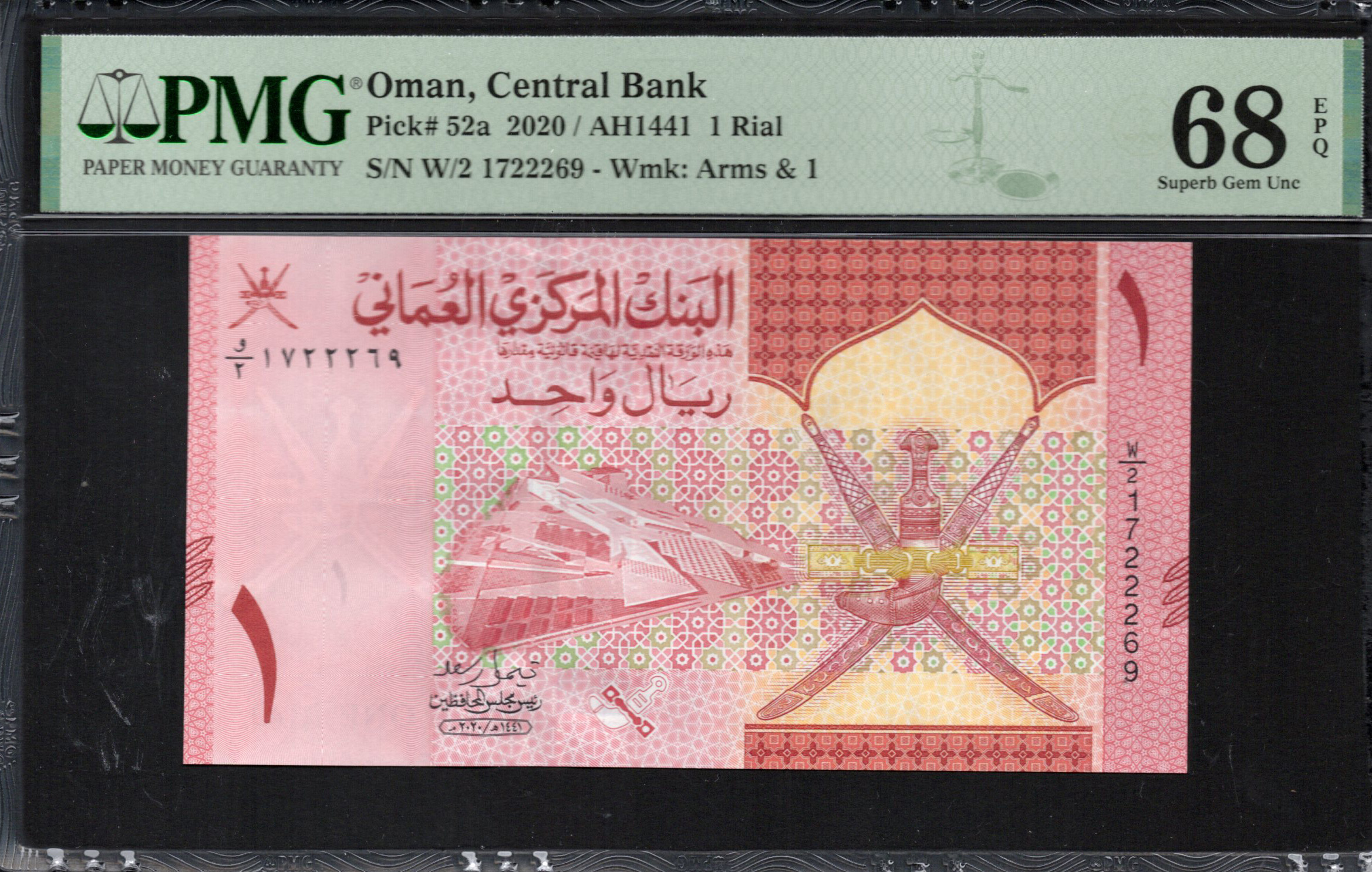 The front of the Omani 1 Rial banknote features a prominent design that includes the national emblem, consisting of crossed swords and a khanjar, symbolizing strength and heritage. The background is adorned with geometric patterns in shades of pink and green, creating a visually appealing composition. Significant security features are present, such as a watermark and micro-printing that enhances the authenticity of the note. The denomination clearly displayed as '1' adds to its readability. The overall artistic elements reflect Omani culture, making the note not only a currency but also a piece of art.