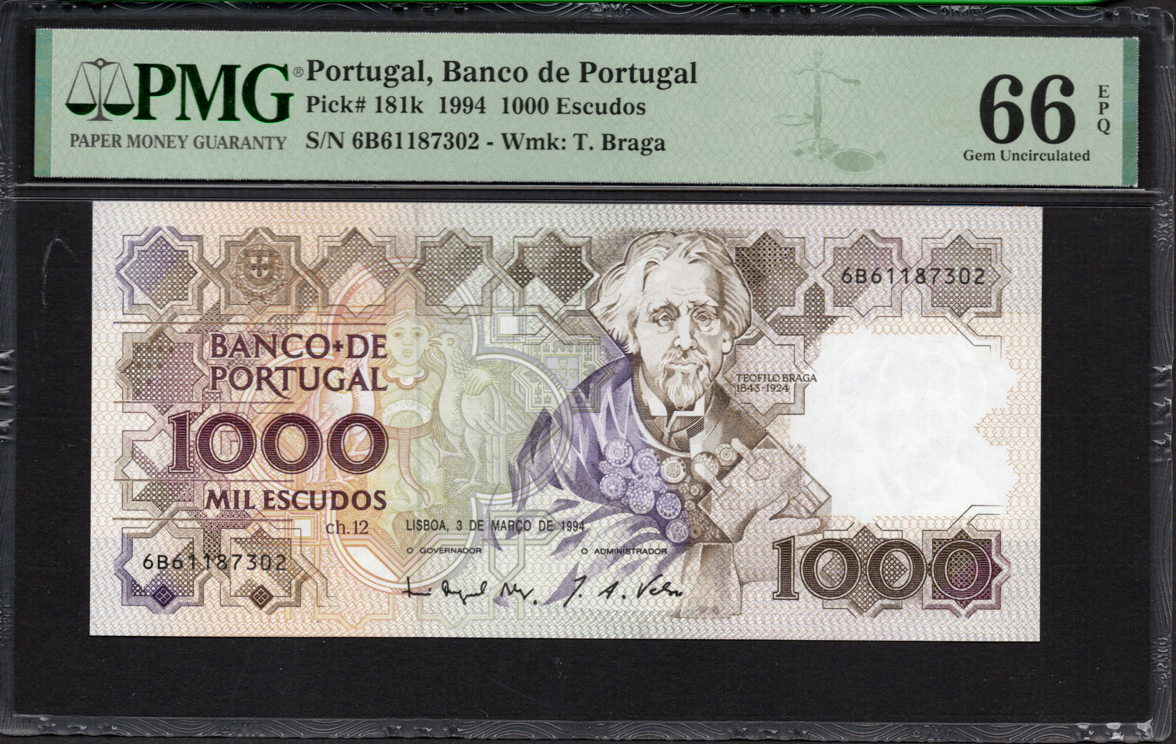 The 1000 Escudos banknote issued by the Banco de Portugal in 1994 features artistic and security elements that reflect the nation's heritage. On the front side, a portrait of Teófilo Braga, a key figure in Portuguese history, is prominently displayed alongside intricate geometric patterns. The note incorporates various shades, primarily in purple and orange, enhancing its aesthetic appeal. Additionally, security features like watermarks and microtext are integral to preventing counterfeiting. The back side carries complementary designs and symbols, enriching the overall narrative of the banknote while adhering to strict anti-counterfeit measures.