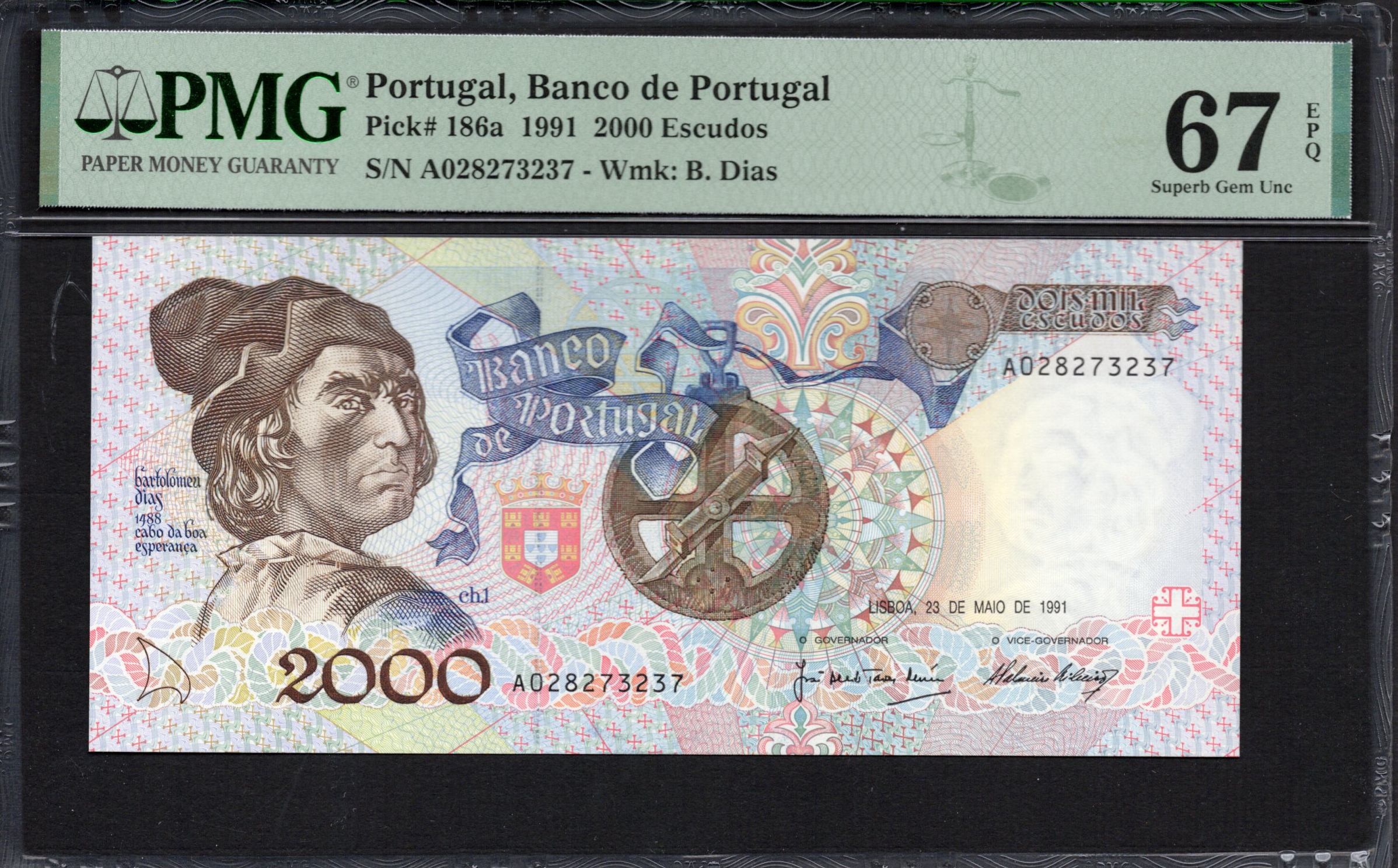 The front of the 2000 escudos banknote prominently displays a portrait of Bartolomeu Dias, the Portuguese explorer, set against a backdrop of soft pastel colors that include pink and blue hues. The meticulous detailing in his hair and facial expression adds a touch of realism, while the overlay of decorative patterns enhances its artistic quality. Noteworthy security features such as a watermark and microprinting provide added protection against forgery. The denomination '2000' is displayed prominently, along with the issuing bank's name and emblem, reflecting Portugal’s cultural heritage.