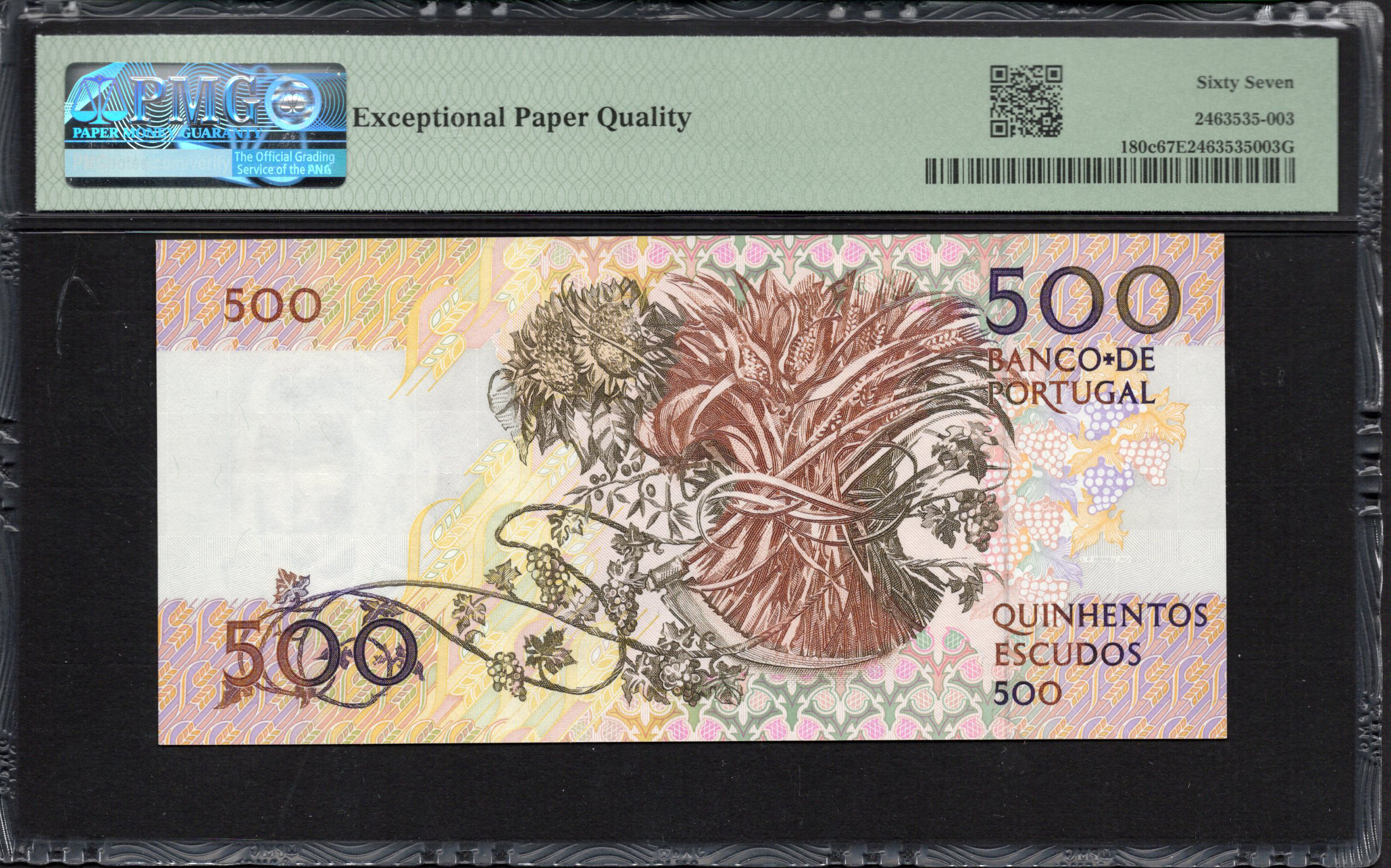 The back of the 500 Escudos note carries forward the artistic theme found on the front, showcasing an abstract design that mirrors the vibrant colors and patterns. This side includes numerals and text that reiterate the denomination and bank name. The overall design is aesthetically pleasing, featuring fluid lines and shapes that evoke a sense of movement and stability. Security features, such as microprinting and potentially a holographic element, serve to protect against counterfeiting while also adding to the artistic complexity of the note. The combination of artistic and security elements reflects the dual functionality of currency as both a medium of exchange and a piece of art.