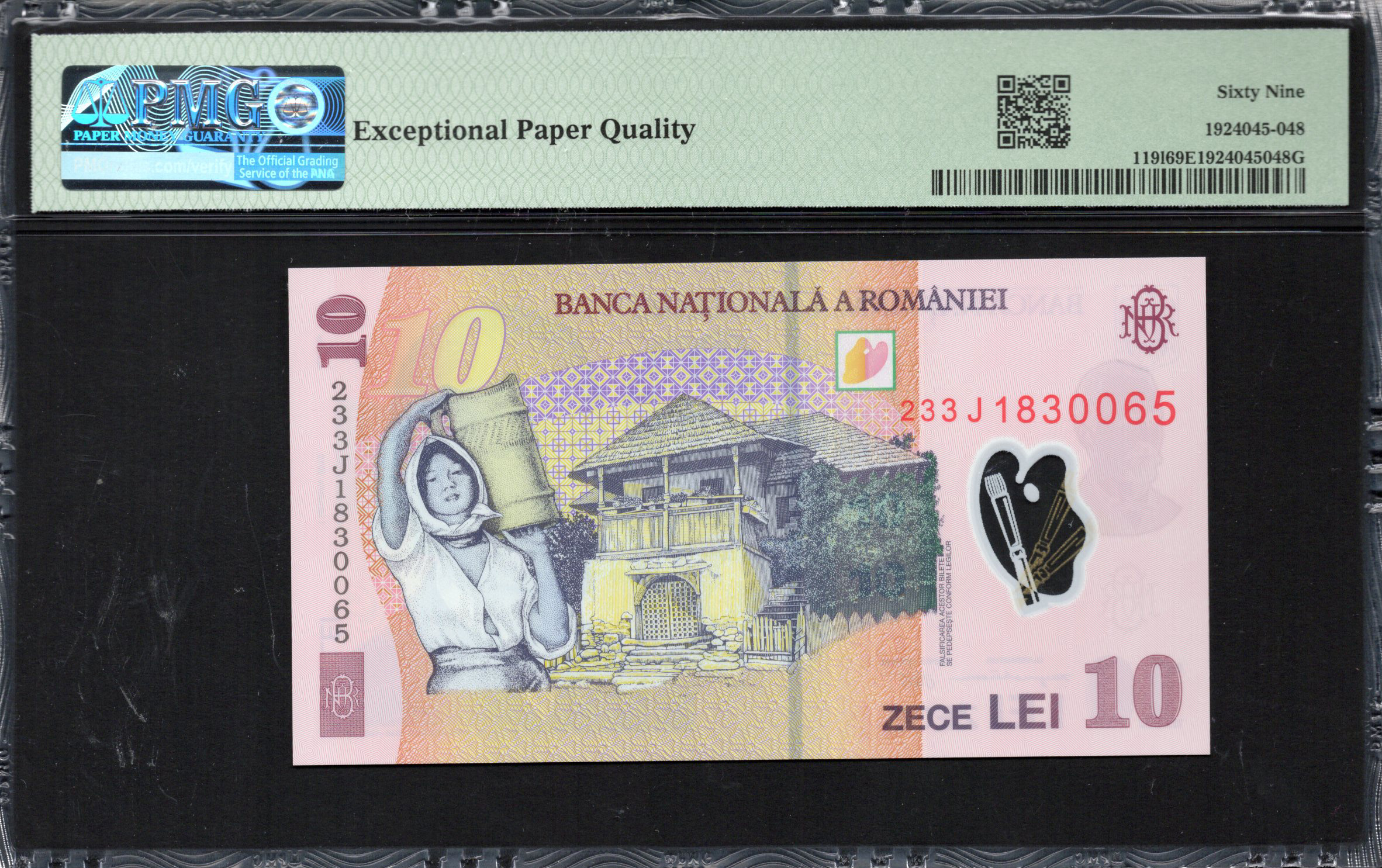 The Romanian 10 Lei banknote, featuring the portrait of Nicolae Grigorescu, showcases the rich cultural heritage of Romania. This polymer note combines vibrant colors and artistic motifs, making it a significant addition to any collection. The front displays a detailed illustration of Grigorescu alongside various artistic elements, such as brushes and flowers, reflecting his contributions to Romanian art. The reverse side features more intricate designs, enhancing its appeal and security features, ensuring authenticity.