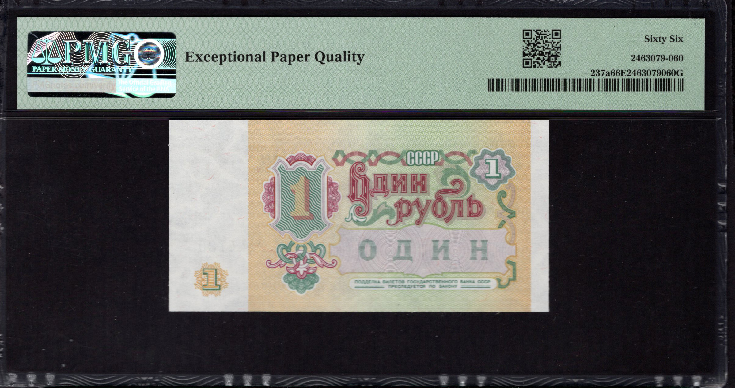 The reverse side of the note primarily displays the denomination '1 Ruble' and includes decorative elements typical of Soviet design, such as geometric patterns. The use of soft colors, including pale yellows and greens, contributes to an aesthetically pleasing presentation. There may be additional security features like holograms or intricate patterns that prove challenging for counterfeiters. Overall, both sides reflect the historic significance and artistic value of late Soviet currency.