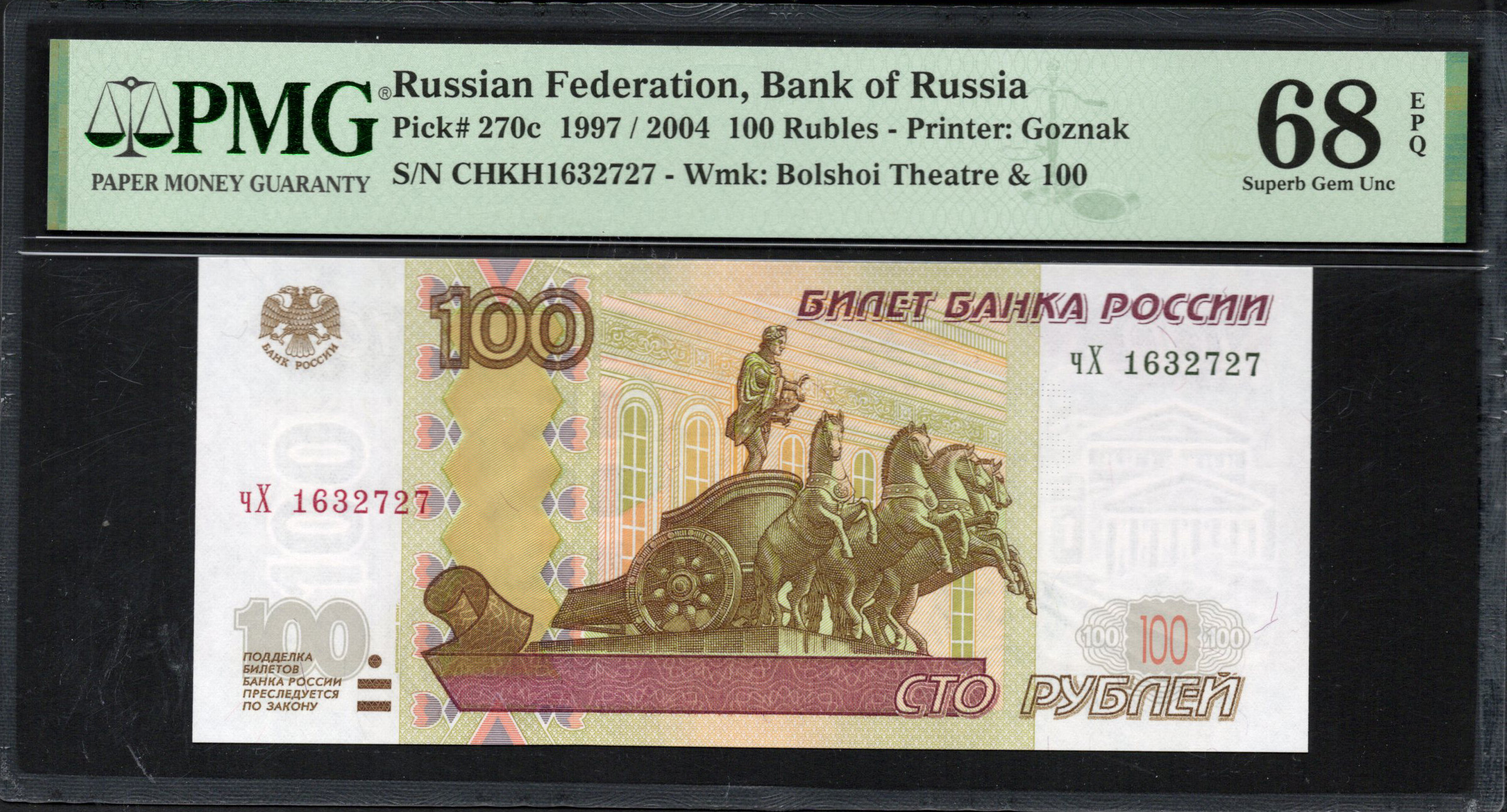 This Russian 100 Rubles banknote features prominent cultural and historical symbols. Issued by the Bank of Russia, it showcases an intricately designed artistic representation of the Bolshoi Theatre, a significant landmark in Moscow, symbolizing the rich heritage of Russian arts.