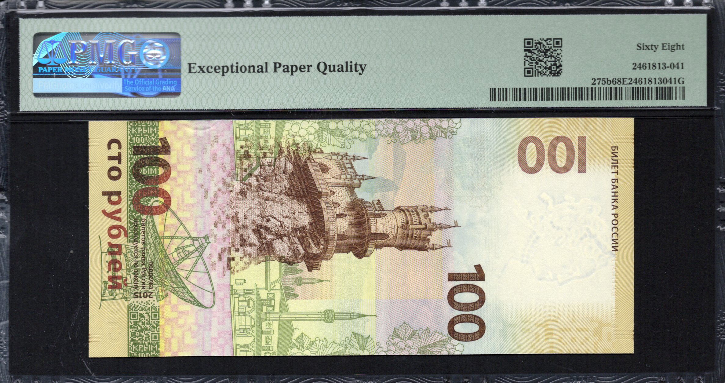 The front of the banknote prominently features the large numeral '100' in a bold font, clearly indicating its denomination. Background details include stylized images of important architectural structures and the portrait of a historical figure, likely Catherine II. The overall color scheme of the front is a mixture of soft yellows and greens, giving it a warm and inviting appearance. Multi-layered security features are visible, such as a watermark and microprinting, which add to the banknote's integrity and authenticity.