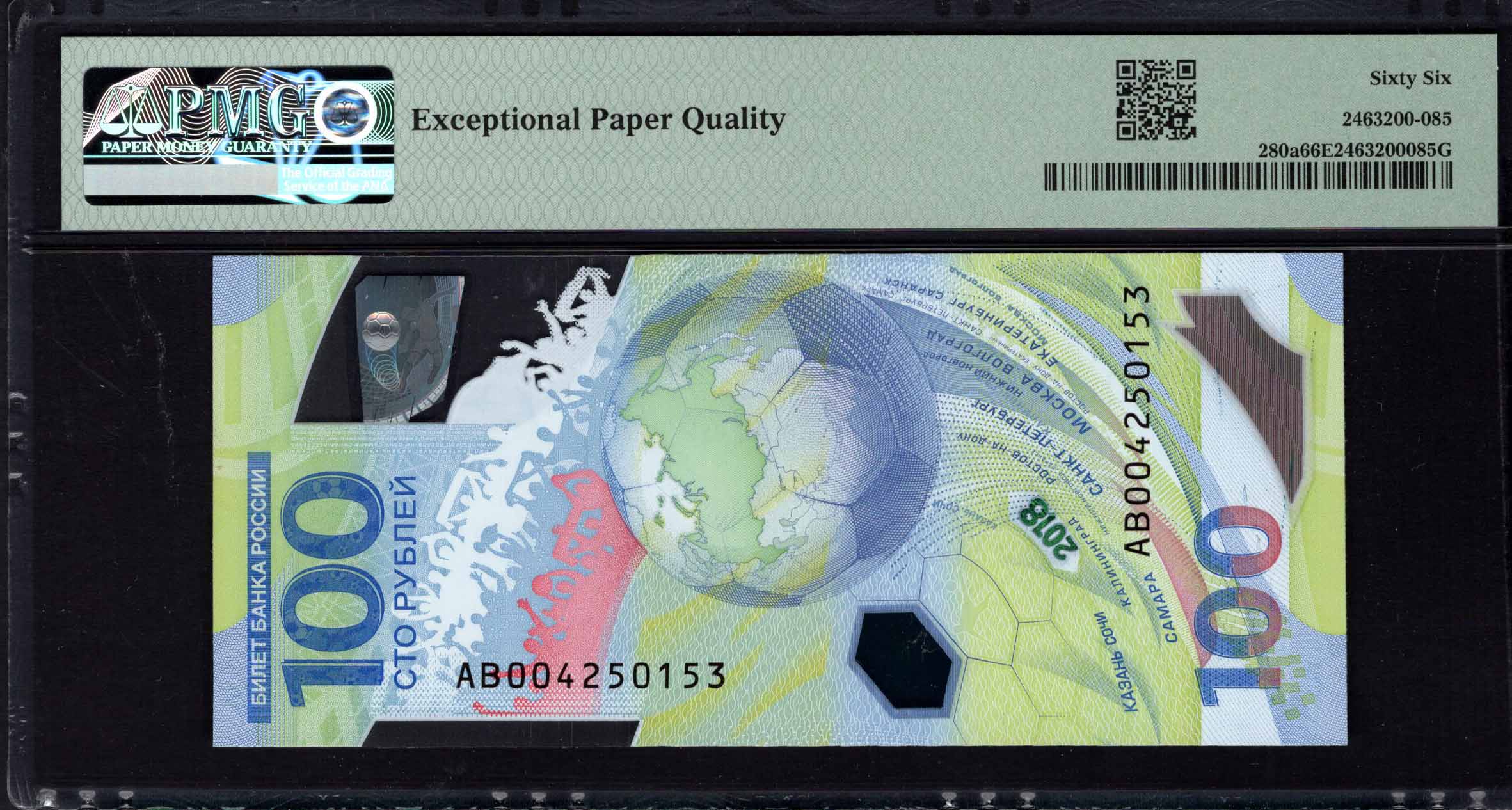 The 100 Rubles banknote from Russia, issued in 2018, commemorates the FIFA World Cup and showcases vibrant designs reflective of the event's spirit. This polymer note features a mix of colors, primarily greens and blues, designed to capture the excitement of football. It includes various security features and artistic elements symbolizing national pride.