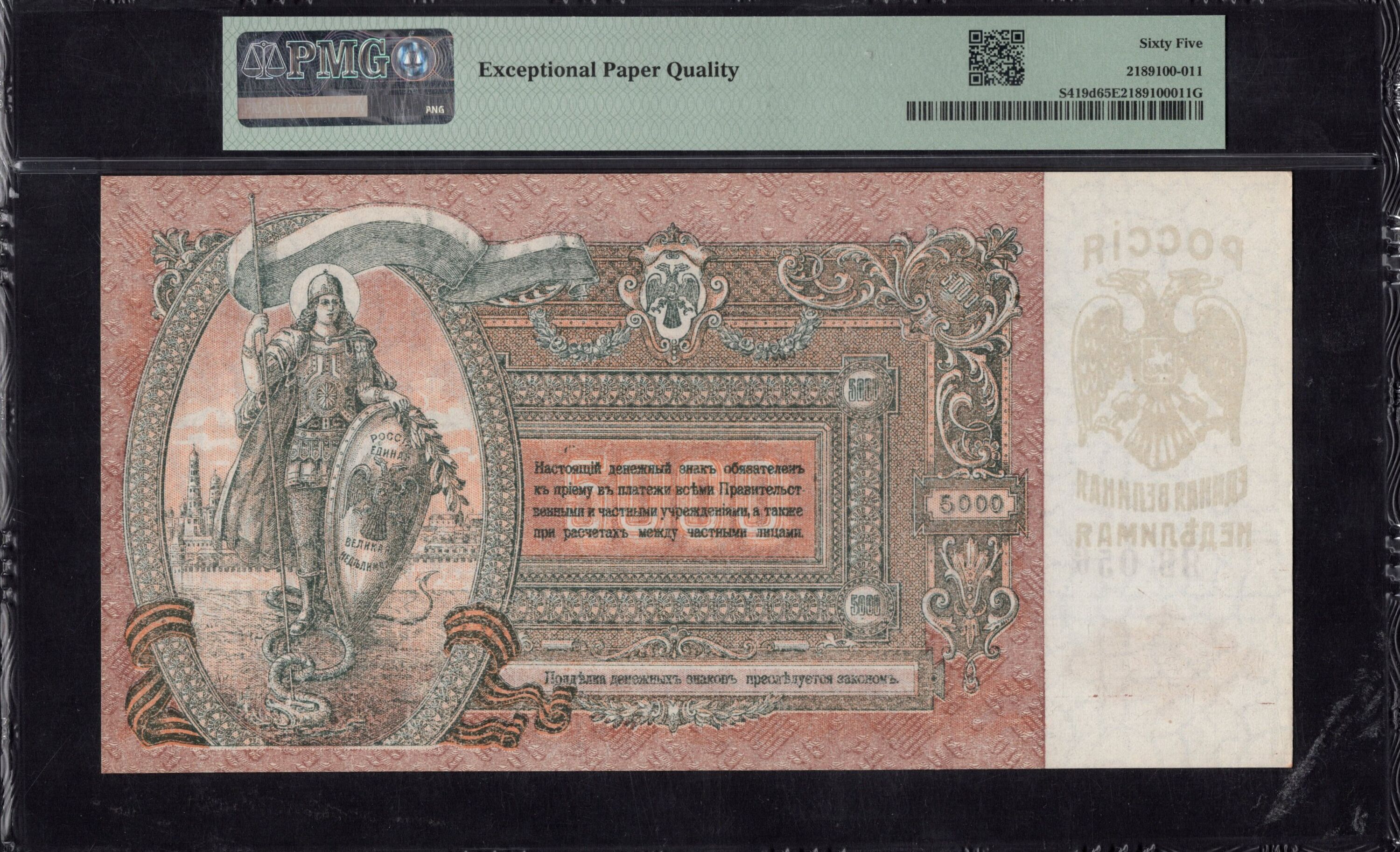 The back of the banknote continues the intricate design theme of the front, featuring more detailed ornamentation and another depiction of the eagle. The denomination and '5000 Ruble' text are prominently displayed, ensuring clarity of value. The layout balances aesthetics with essential text, including serial numbers and government insignia. As with the front, various security features are incorporated, including possible holograms or patterns that are common in banknotes of this era. The use of rich colors and elaborate graphics really captures the essence of early 20th-century Russian banknotes.