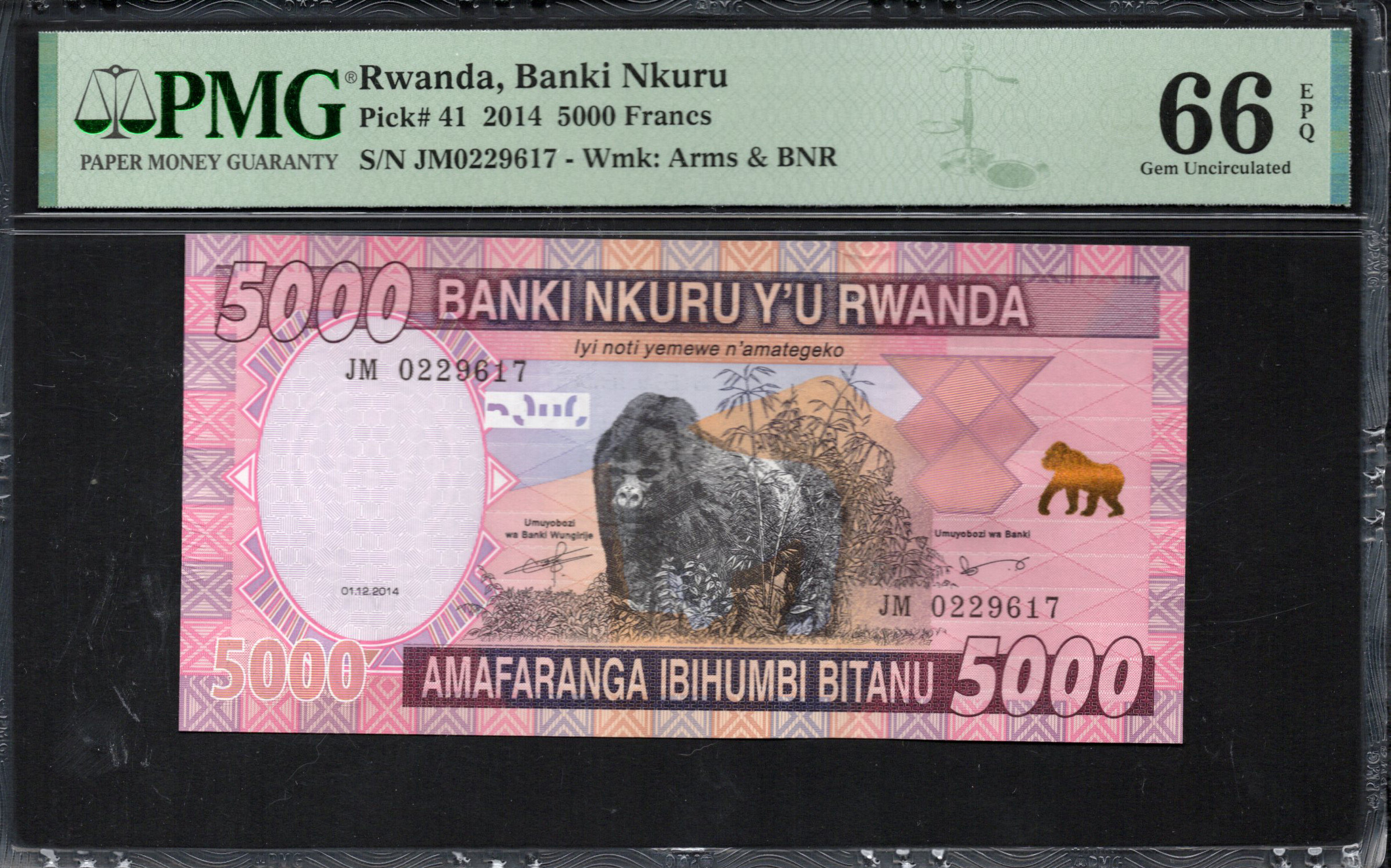 The Rwandan Banki Nkuru Y'u Rwanda 5000 Francs note from 2014 showcases the rich heritage and natural beauty of Rwanda. Featuring the iconic mountain gorilla, a symbol of conservation efforts in the region, this banknote is not just currency but an artistic representation of Rwandan identity. The vibrant colors, detailed patterns, and security features make it a remarkable piece of paper money that reflects both cultural significance and modern design standards.