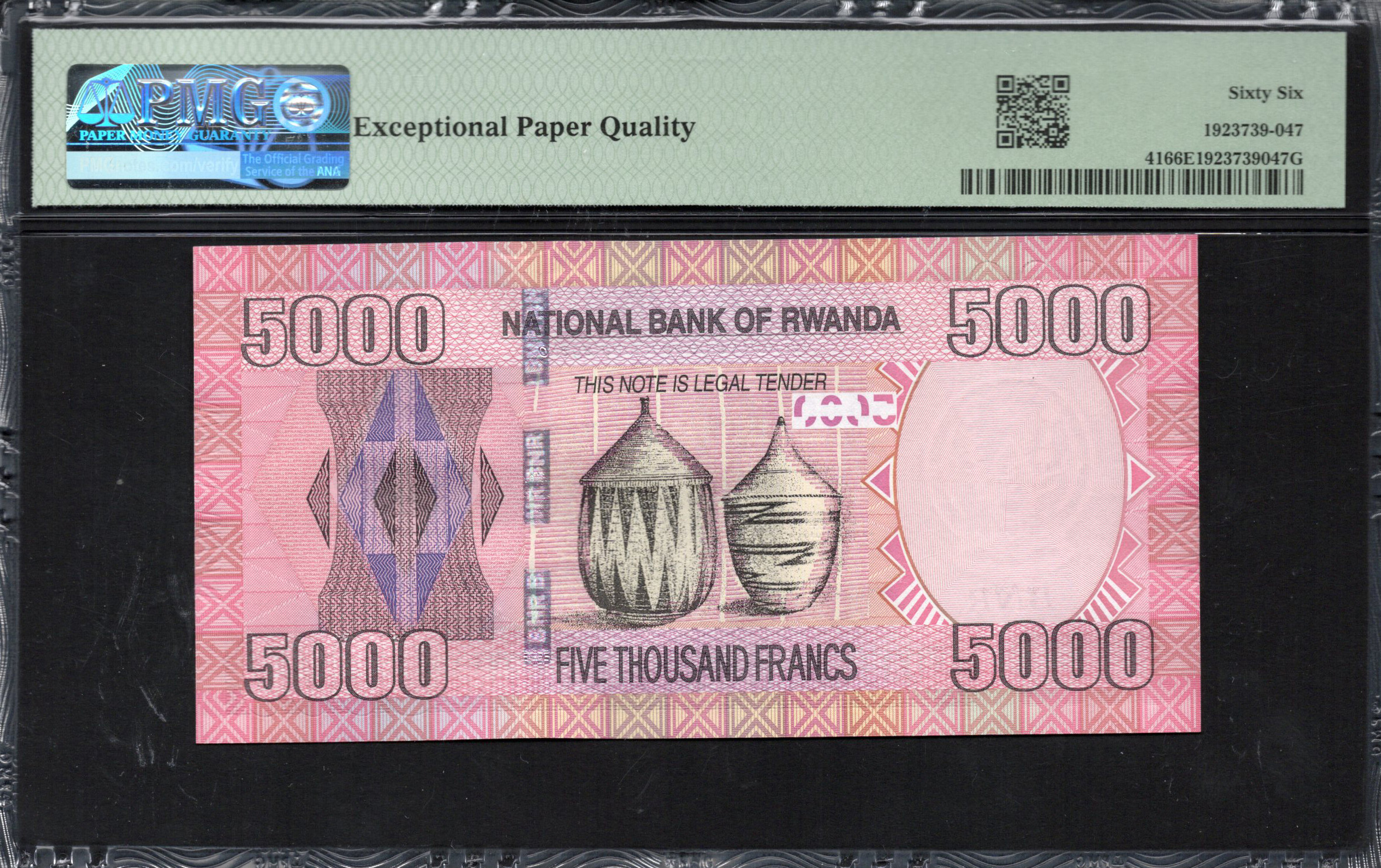 The front of the 5000 Francs banknote prominently displays a lifelike image of a mountain gorilla, a national symbol, surrounded by intricate geometric patterns in various shades of pink and purple. The denomination is clearly visible in large numbers, contributing to its aesthetic appeal, while inscriptions highlight its identity and value in Kinyarwanda. Security features include a watermarked area, microtext, and intricate color variations, making counterfeiting more difficult.