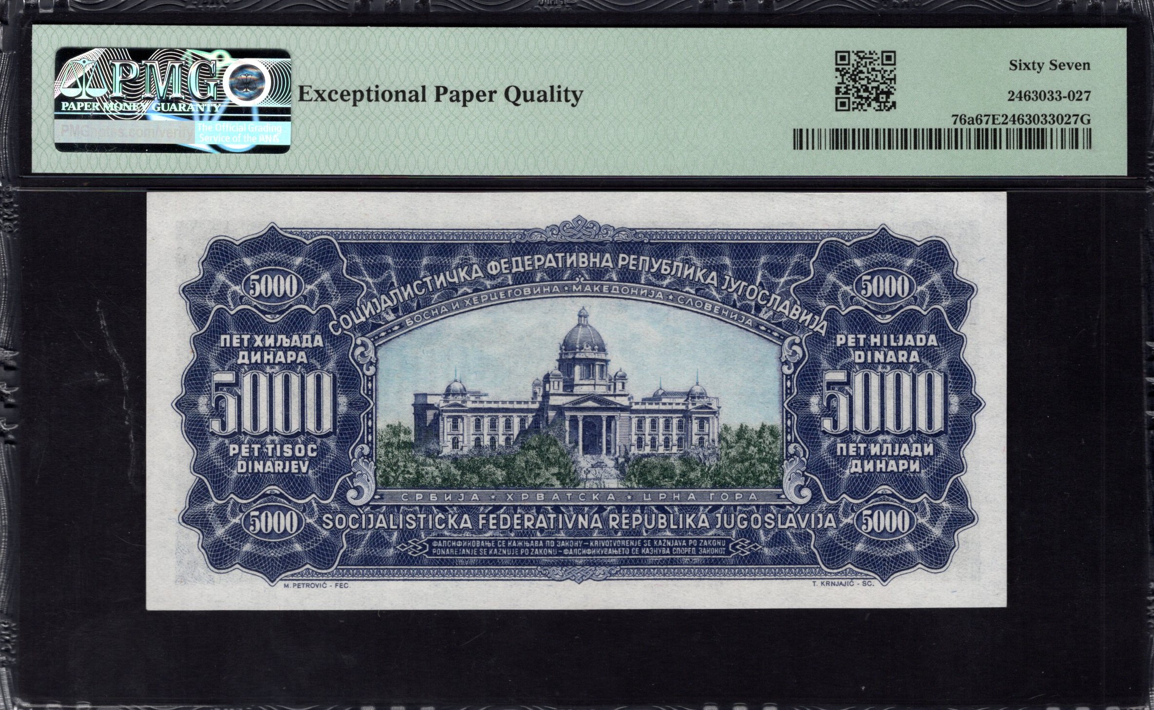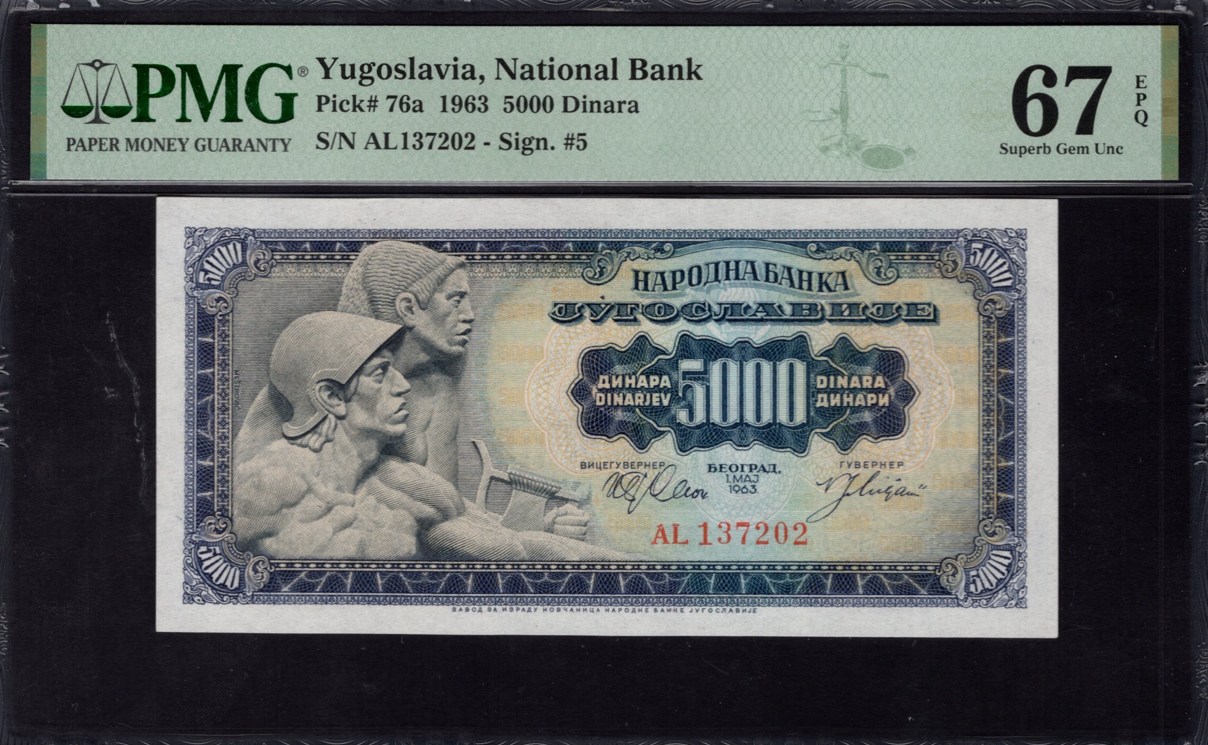 The Yugoslav 5000 Dinar banknote, issued in 1963, features intricate artwork and serves as a significant representation of the country's history and culture. The front showcases a powerful depiction of two male figures symbolizing labor, strength, and the working class, which highlights the socialist ideals prevalent at that time. Its color palette includes shades of blue and green, complemented by ornamented borders. The reverse side, while not shown here, typically includes detailed motifs that contribute to the overall artistry of the note. This banknote exemplifies the merging of aesthetics with security features that protect against counterfeiting, making it a worthy focus for collectors and enthusiasts of numismatics.
