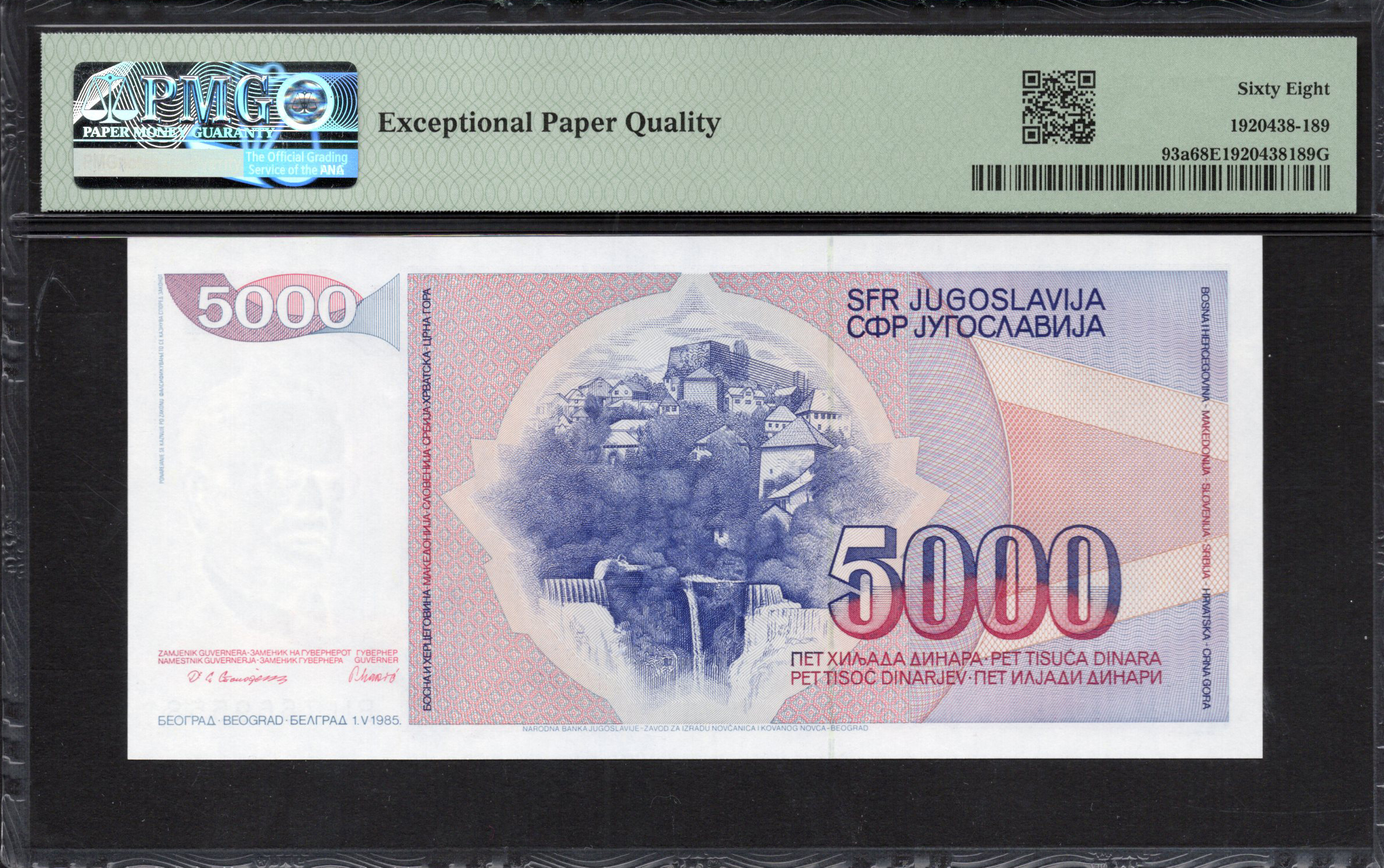 This banknote from Yugoslavia showcases the rich history and distinct design features typical of its time. The 5000 dinar note is notable for its vibrant colors, intricate patterns, and prominent imagery. On the front, a dignified portrait is depicted, representing leadership and authority, surrounded by stylized designs that reflect national pride. The reverse side continues this theme with detailed engravings that symbolize the country's heritage and values. Noteworthy security features include a watermark and microprinting that ensure authenticity, making this a collectible item for both currency enthusiasts and historians.