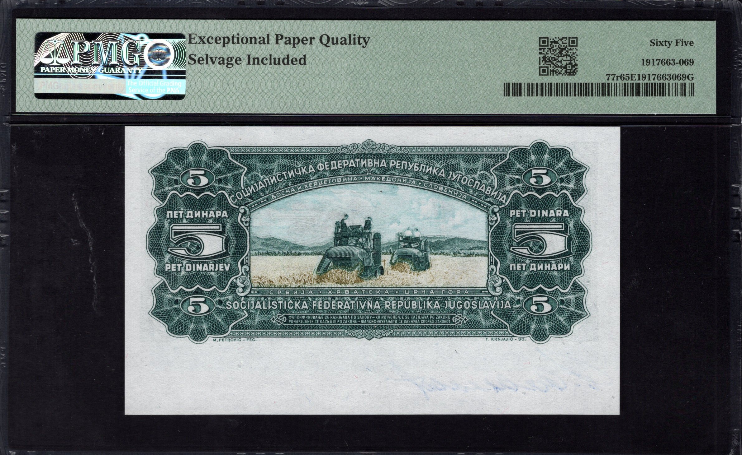 The front of the 5 dinara banknote prominently displays a portrait of a woman, elegantly rendered in a soft green palette that evokes a sense of serenity. The intricate borders feature ornate patterns, contributing to the note's artistic appeal. Beneath the portrait, you can see subtler design elements like microprinting and a signature, enhancing both the aesthetic and security features. The overall composition combines artistic expression with practical aspects, creating a noteworthy example of 1960s banknote design.