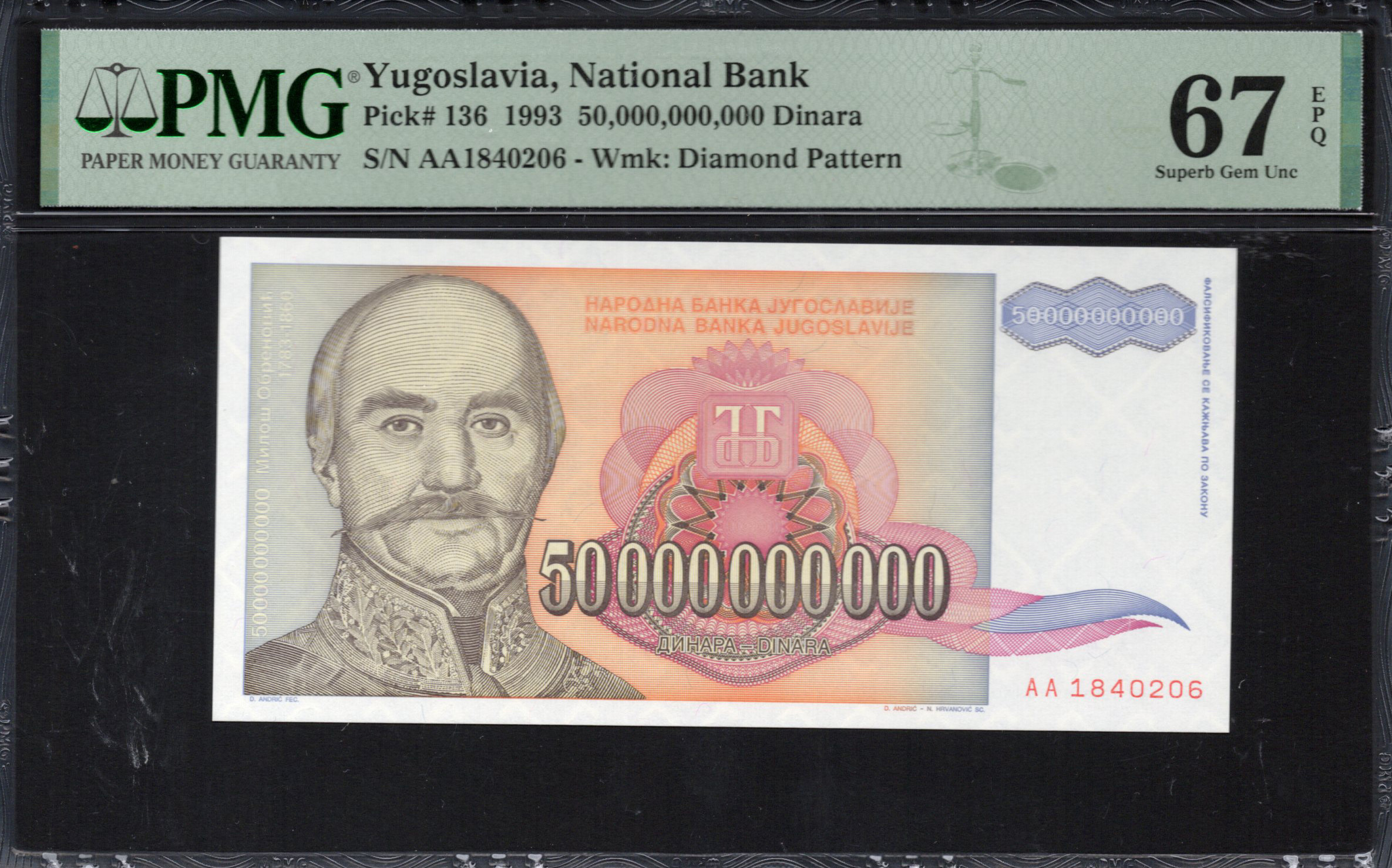 The front side of the 50 million dinars banknote prominently features the intricate portrait of a historical figure dressed in a decorative military uniform, showcasing fine details that exemplify traditional craftsmanship. Accompanying the portrait are vibrant hues of brown and pink that create a visually striking background. The denomination, '50,000,000', is boldly displayed in large numerals, while the bank's name and other textual elements are elegantly integrated into the design. The use of ornamental patterns surrounding the figure adds an artistic flair, enhancing the note's overall presentation. Additionally, a watermark can be discerned, ensuring a sense of security and authenticity.