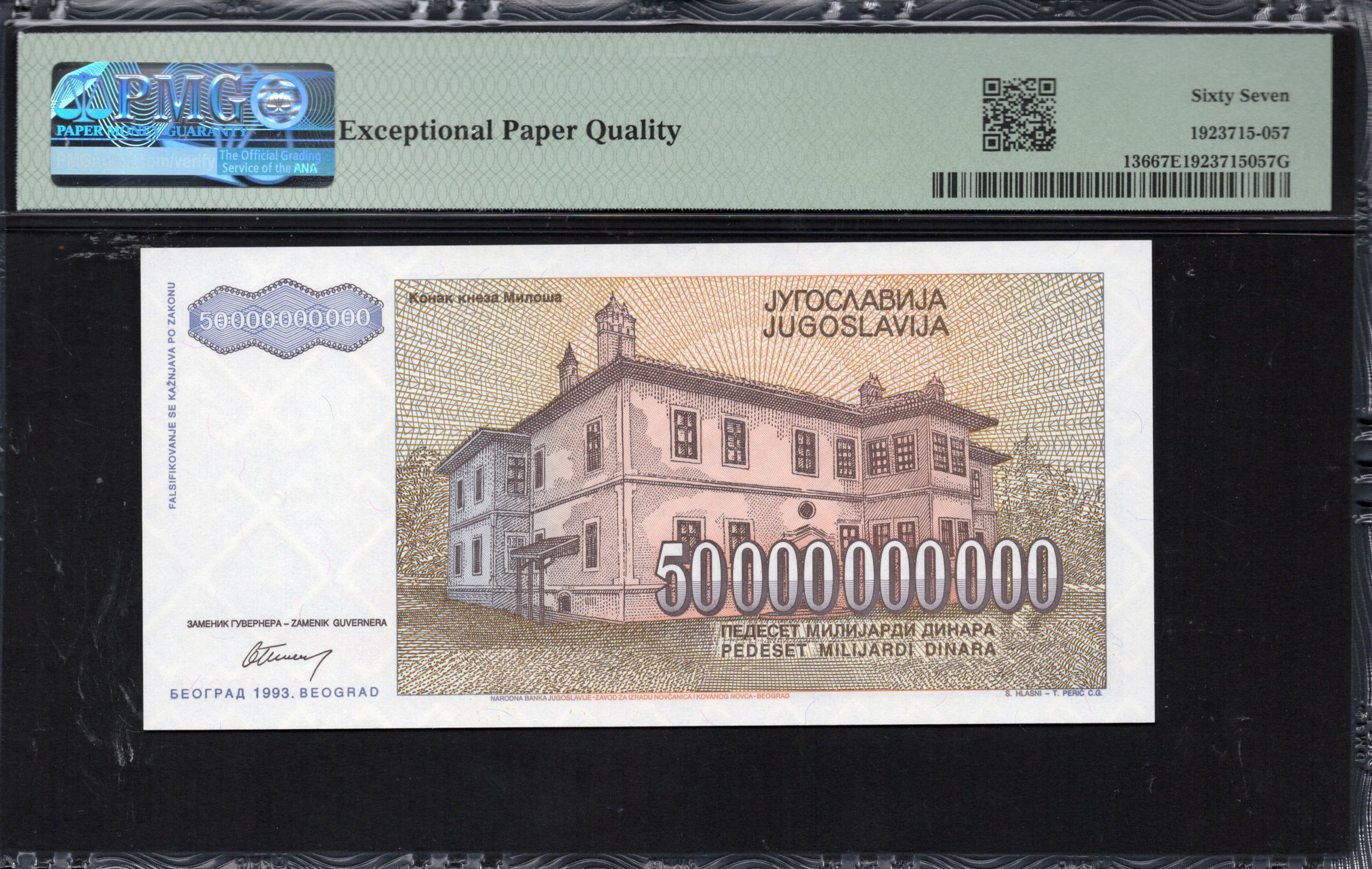 The 50 million dinars banknote from Yugoslavia, issued in 1993, is a remarkable piece of currency that symbolizes the economic history of the region. The front features a prominent portrait of a distinguished historical figure, adorned in an ornate military uniform, which reflects the national pride. The background incorporates intricate patterns and a vibrant blend of colors including shades of brown and pink, effectively highlighting the denomination. The back of the note showcases additional artistic elements, further enhancing its aesthetic value. Security features include a watermark and microprinting, ensuring its authenticity. Collectors and historians value this banknote not just for its monetary worth but also as a representation of a unique period in Yugoslav history.