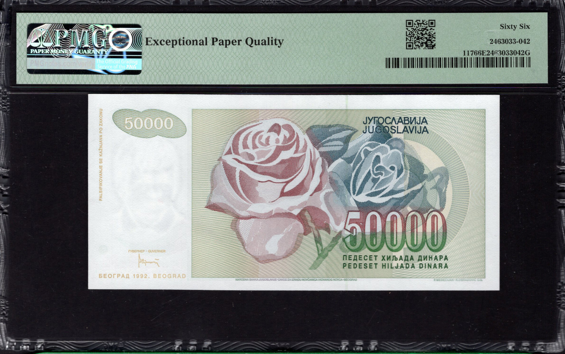 The 50,000 dinara banknote from Yugoslavia is a striking piece of currency, showcasing intricate designs and significant artistic elements. Issued by the National Bank, the front features a portrait of a young boy, conveying innocence and the essence of youth. The background is adorned with green gradients and abstract patterns, which enhance its visual appeal. The banknote incorporates various safety features, including microprinting and a watermarked paper to prevent counterfeiting. The color palette primarily consists of greens and light purples, creating a harmonious look. This note is not only a means of transaction but also a reflection of the cultural heritage of Yugoslavia.