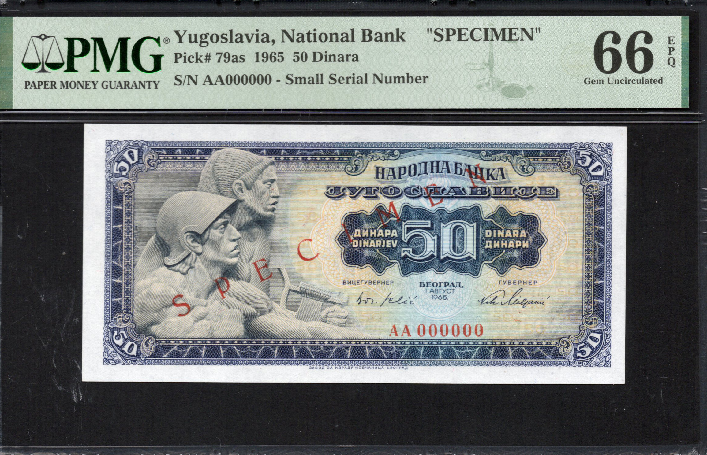 This Yugoslavian banknote, issued in 1965, features intricate designs and symbols characteristic of its time, primarily highlighting national pride through artistic expressions. The front measures 50 dinars, adorned with prominent figures and an ornate border that tells a story of the country's history. The inclusion of the word 'SPECIMEN' indicates its status as a sample banknote, often used for educational or archival purposes. The note showcases a palette of blues and grays, with fine detailing and security features that ensure its authenticity.