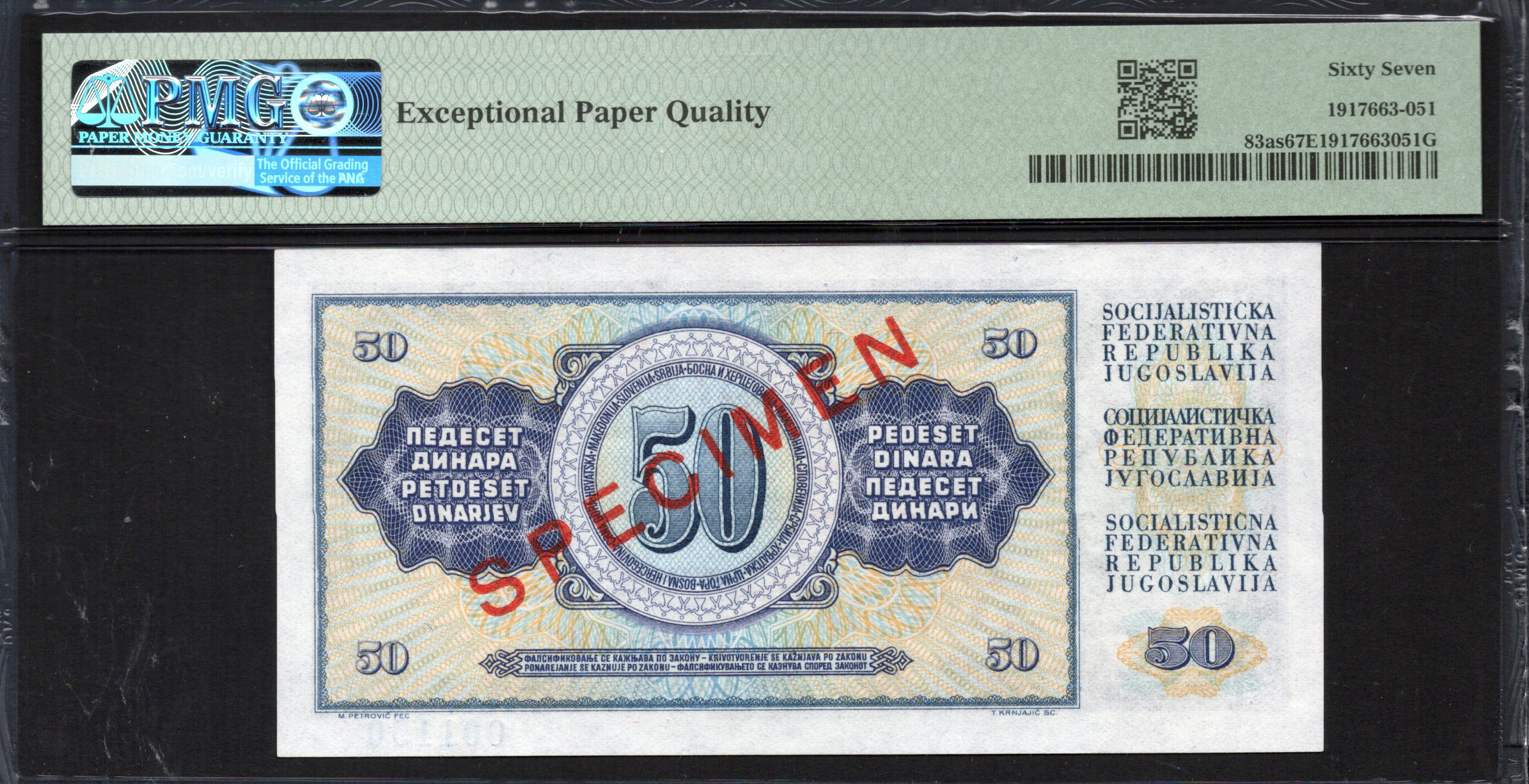 The Yugoslavian 50 Dinar banknote from 1968 is a compelling piece of history, showcasing rich cultural and artistic elements. The front features intricately designed portraits of prominent historical figures, symbolizing strength and resilience. The banknote boasts a unique color palette, with shades of blue and subtle pastels creating a visually appealing contrast. Notably, safety features like the watermark and microtext enhance its authenticity, providing security against counterfeiting. Additionally, the prominent use of the word 'SPECIMEN' indicates this note is a collector's item, designated for promotional purposes rather than general circulation.