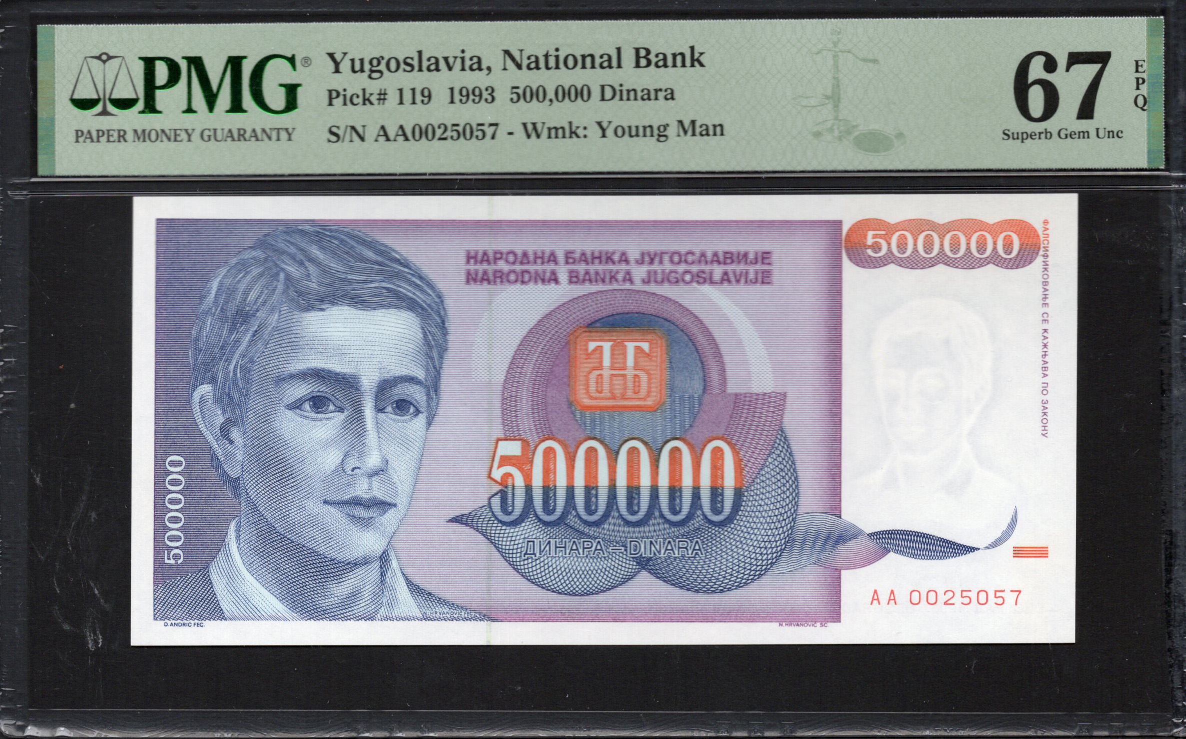 The 500,000 dinar banknote from Yugoslavia, issued in 1993, showcases a blend of artistic elements and security features that highlight its significance in currency design. Dominating the front is a portrait of a young man, rendered in blue and purple hues, which creates a striking visual impression. The denomination is clearly marked in large numerals and accompanied by ornate patterns, enhancing its aesthetic appeal. Notably, the background contains subtle watermark features that contribute to its security, alongside microtext that aids in authenticity verification. This banknote represents a unique period in Yugoslav history and provides insight into the financial landscape of the region at the time.