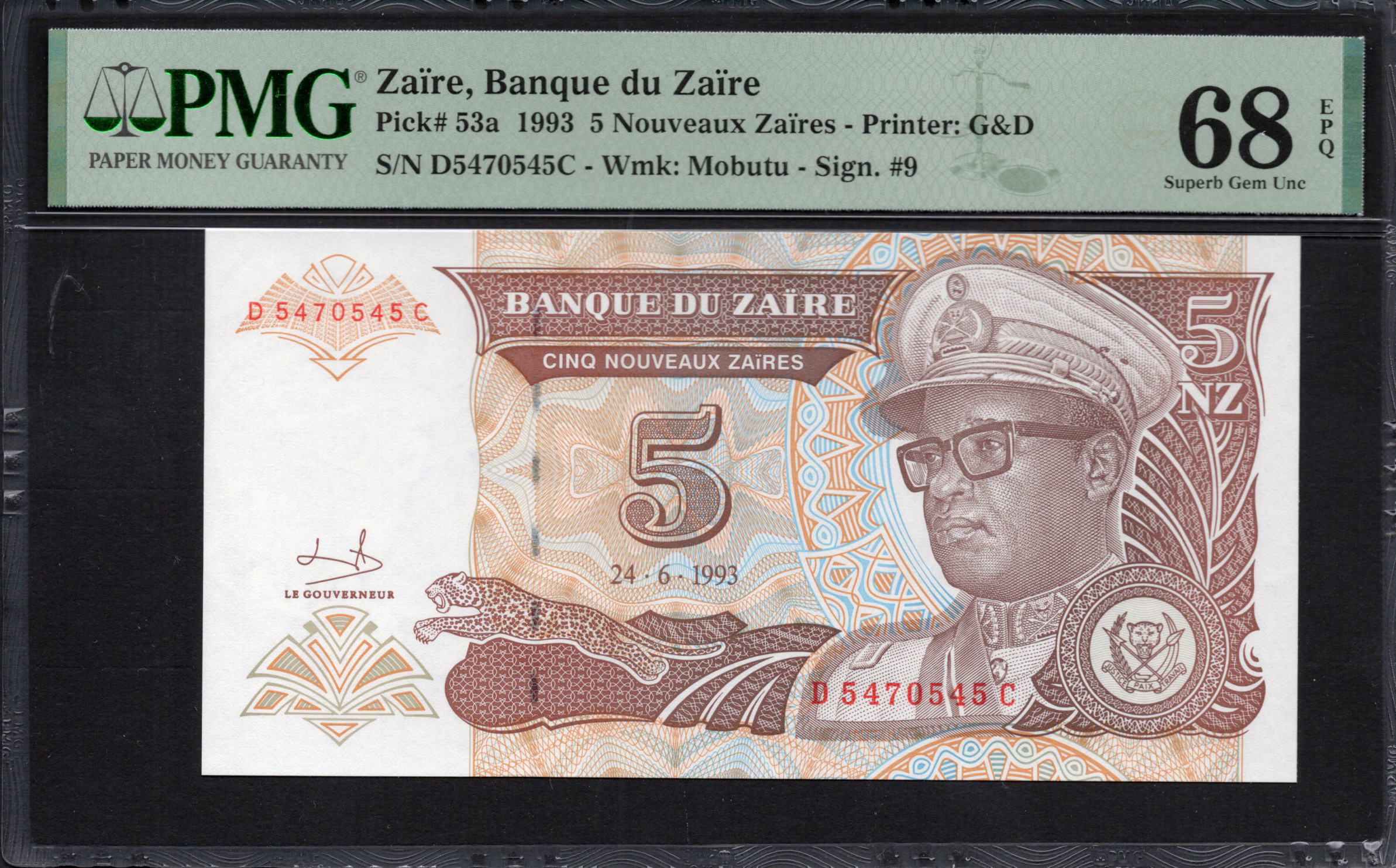 The 5 Zaire banknote represents an important cultural artifact from the Democratic Republic of the Congo. Issued by the Banque du Zaire in 1993, this note features intricate designs and notable symbols that reflect the nation's heritage. The front displays a portrait of Mobutu Sese Seko, the prominent leader of Zaire, set against a backdrop of decorative patterns. Its details strengthen the narrative of Zaire's identity during this period.