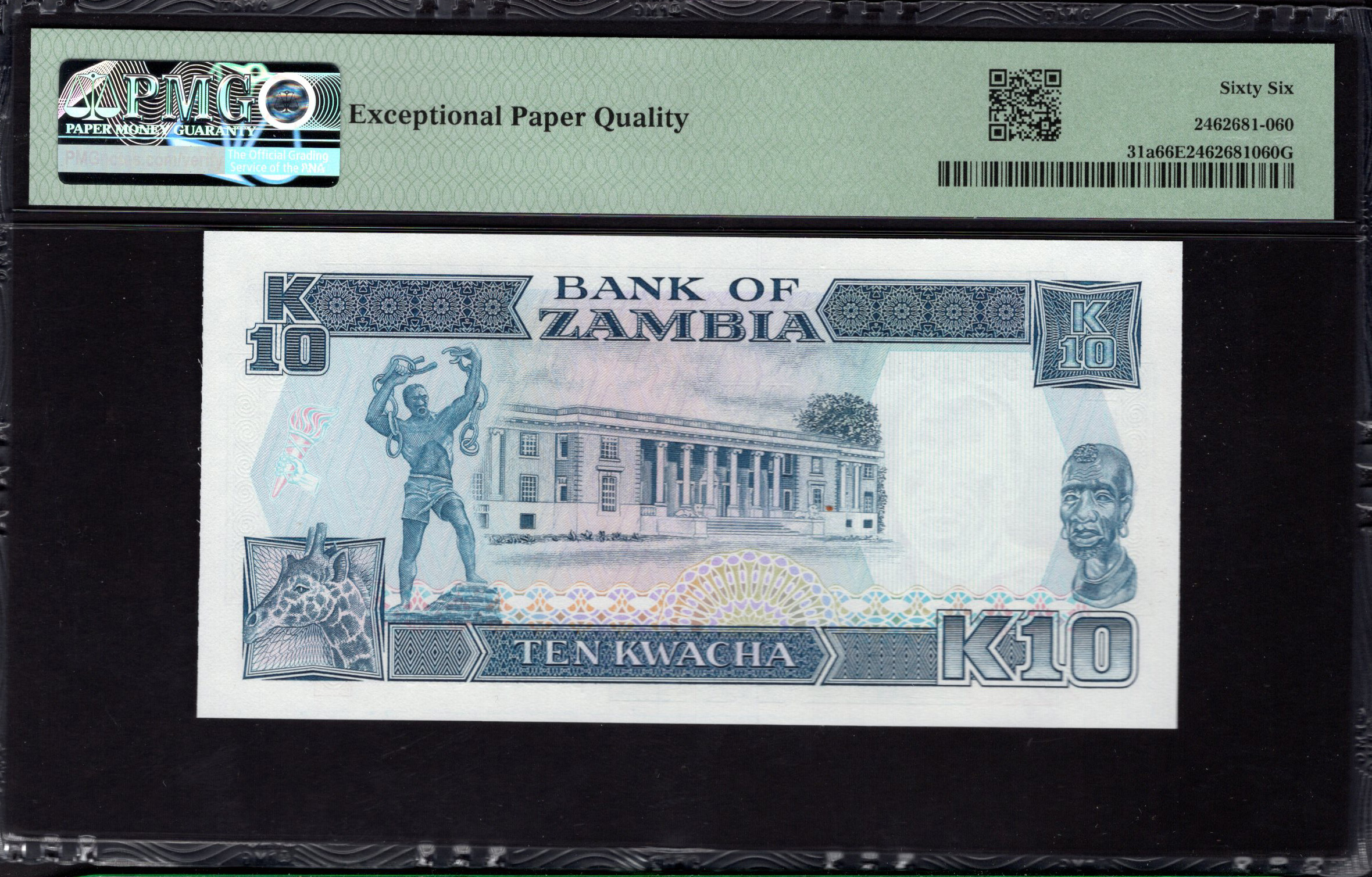 The Zambian 10 Kwacha banknote, issued by the Bank of Zambia, showcases a rich blend of artistic and security features. This note reflects not only the nation's currency value but also its cultural heritage. Featuring vibrant colors and intricate designs, the front side displays an illustration of a prominent Zambian figure along with national symbols, while the reverse includes imagery that highlights Zambia's wildlife, particularly depicting an eagle. The banknote is also equipped with various security features that enhance its authenticity and protect against counterfeiting.
