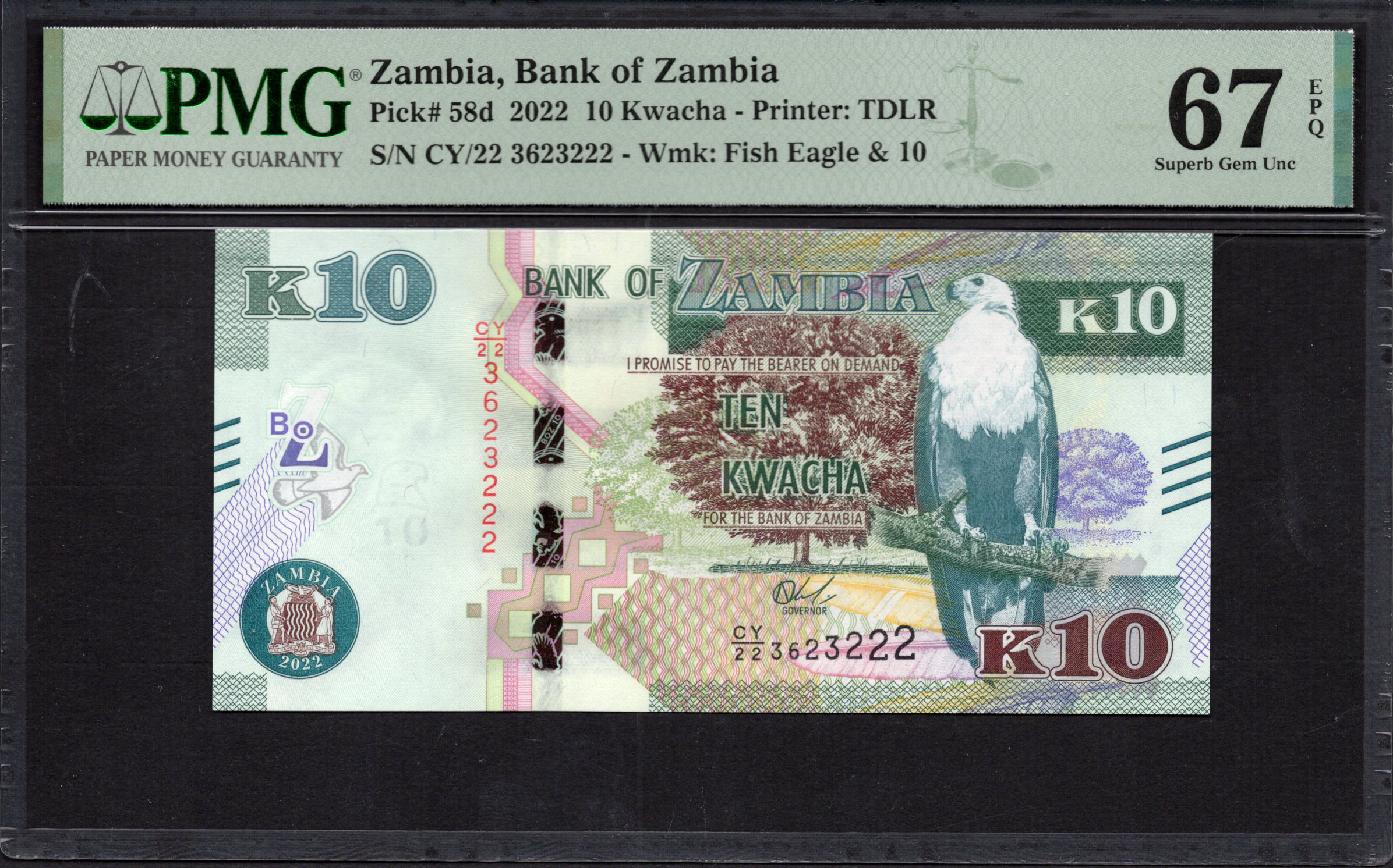 The 10 Kwacha banknote from the Bank of Zambia is a beautiful representation of Zambian heritage and wildlife. Printed in 2022, this banknote features vibrant colors and intricate designs, making it both a functional currency and a work of art. The prominent image of a fish eagle highlights the importance of wildlife conservation in Zambia. In addition to its aesthetic qualities, the banknote is equipped with advanced security features to prevent counterfeiting, ensuring confidence in its use.
