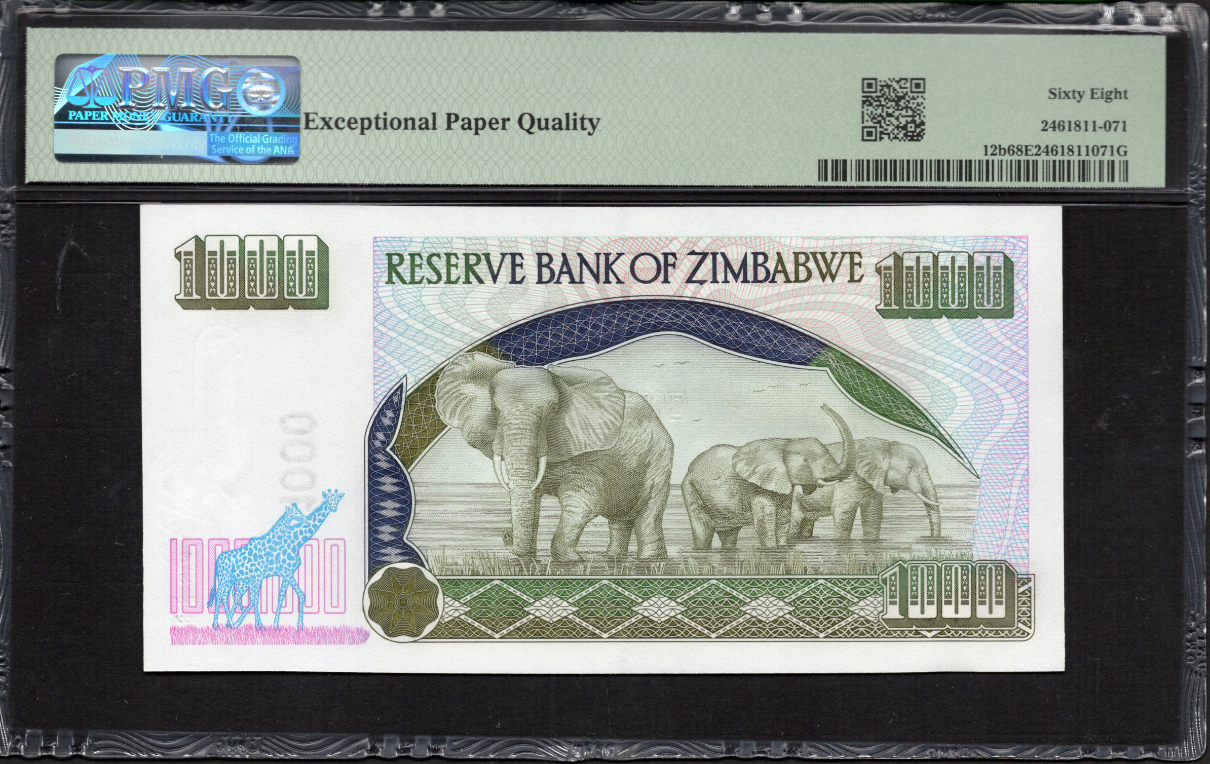 This analysis focuses on a unique banknote from Zimbabwe, specifically the 1000 Dollar denomination issued by the Reserve Bank. Featuring intricate designs and vibrant colors, this note stands out not only for its monetary value but also for its depiction of cultural symbols and wildlife.