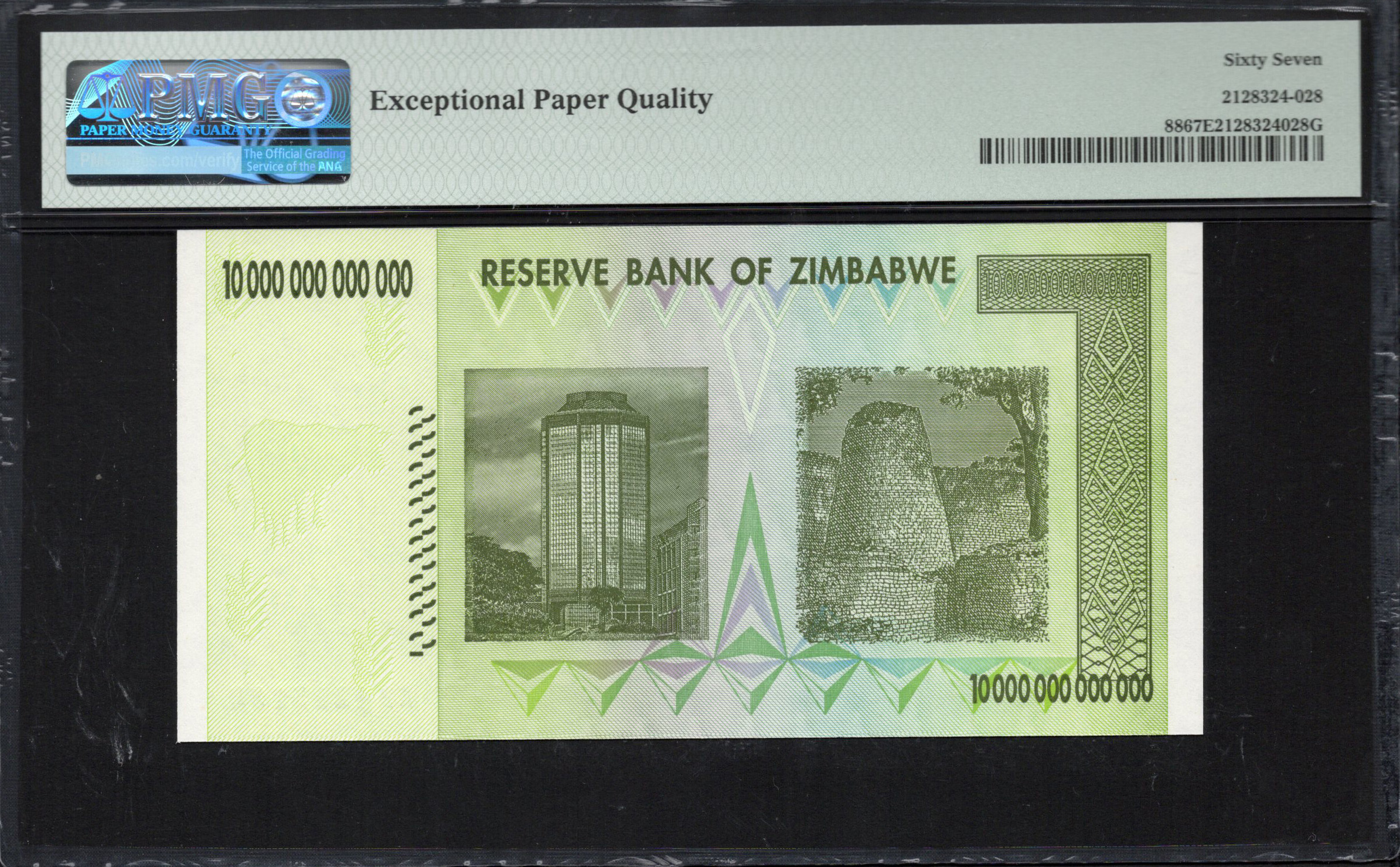 The Zimbabwean 10 Trillion Dollar banknote, issued by the Reserve Bank of Zimbabwe in 2008, is a striking example of currency designed during a period of hyperinflation. The front features an image of stacked stones, symbolizing stability amidst economic turmoil. The green color palette, along with the denomination printed in bold letters, emphasizes the magnitude of the value, which aligns with the historical context of Zimbabwe's economic challenges.