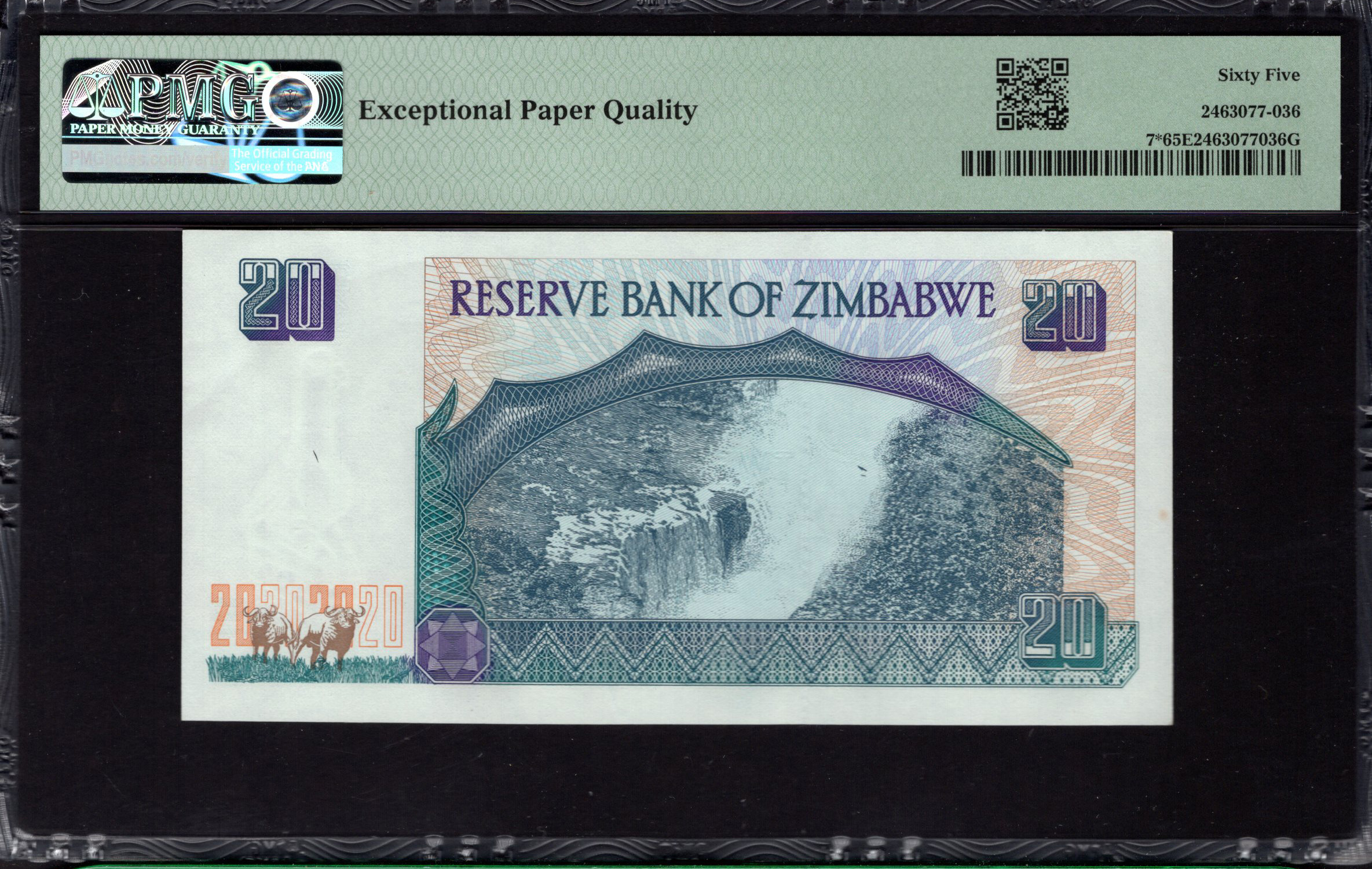 The front of the 20 Dollar banknote features a striking depiction of a stone sculpture, massive and enduring, symbolizing Zimbabwe's ancient civilizations and artistic legacy. The colors utilized, particularly the shades of blue and green, add to its visual richness. Prominent markings include the denomination '20' and the name 'Reserve Bank of Zimbabwe', ensuring clear identification. Additional security features may include a watermark and microtext integrated into the design, reflecting the note's authenticity. The overall composition harmonizes cultural significance with practicality, showcasing the nation's identity alongside security.