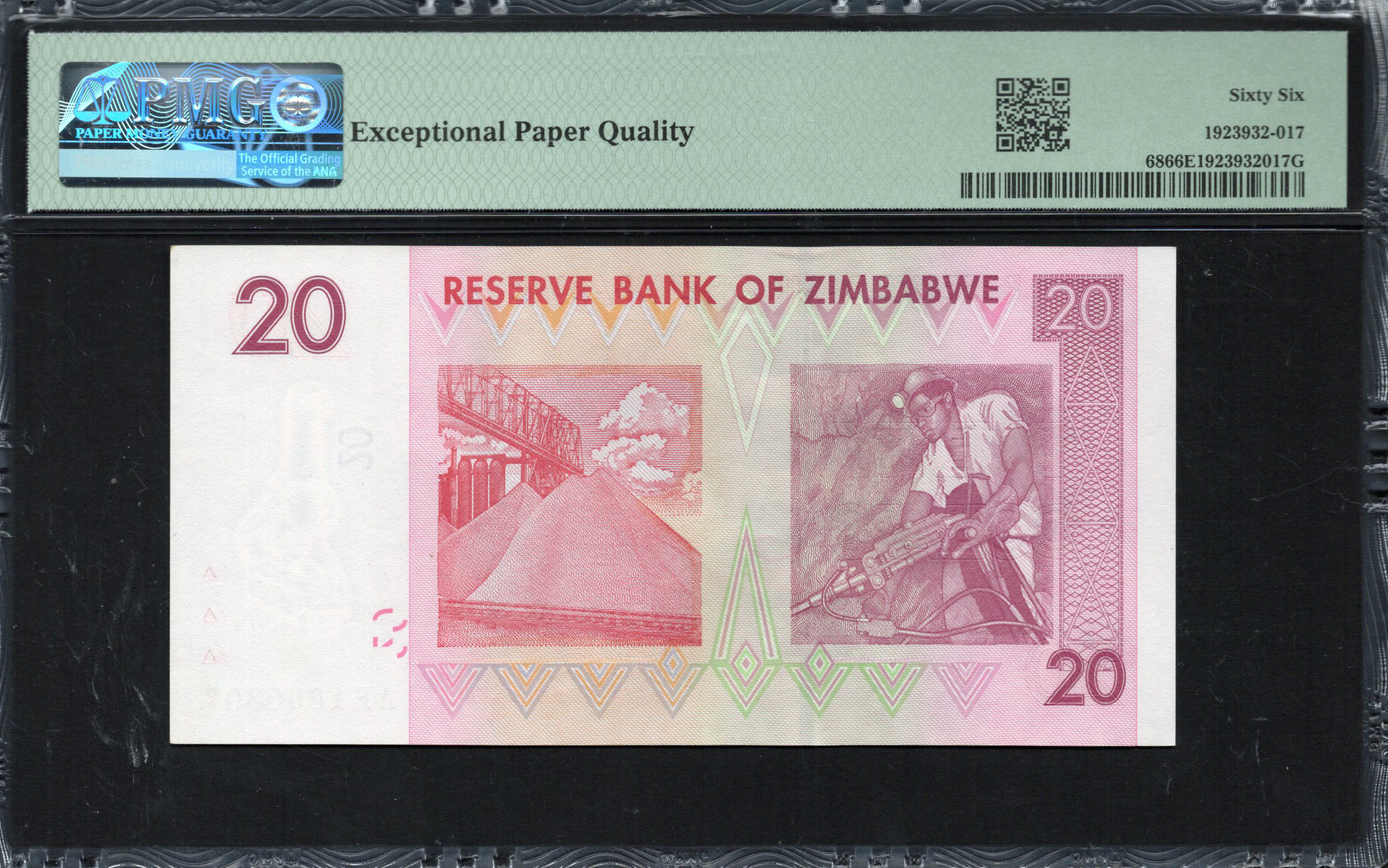 The front side of the banknote showcases a dominant image of colorful stone formations, symbolizing the natural beauty and geological richness of Zimbabwe. The background features pastel colors, primarily pink and beige, which blend harmoniously to enhance readability. Key elements include the large denomination '20' clearly printed on the left, and the inscription 'REVERSE BANK OF ZIMBABWE' prominently displayed at the top. A watermark area featuring intricate microtext and the Zimbabwe Bird provides additional authentication, complemented by a serial number printed in bold black to ensure security.