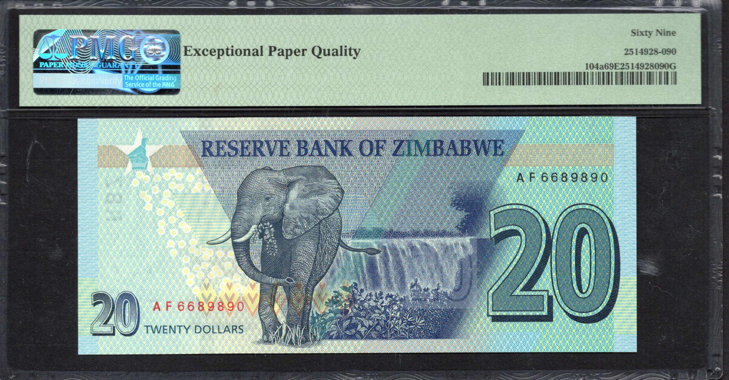 The Zimbabwean $20 note, issued by the Reserve Bank, features intricate designs and vibrant colors that reflect the country's heritage and culture. This particular note, released in 2020, has the notable 'Zimbabwe Bird' watermark and a striking color scheme that combines shades of green and blue. Promising to pay the bearer the specified amount, the design includes unique elements such as denominations prominently displayed and various security features that deter counterfeiting. This banknote serves not only as a currency but also as a collector's item, illustrating the evolving nature of Zimbabwe's financial system.