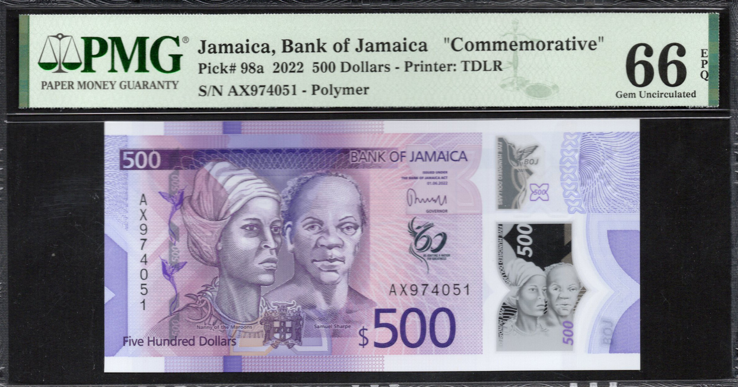 Jamaica - 500 Dollars 2022 - Pick # 98a - PMG 66 EPQ