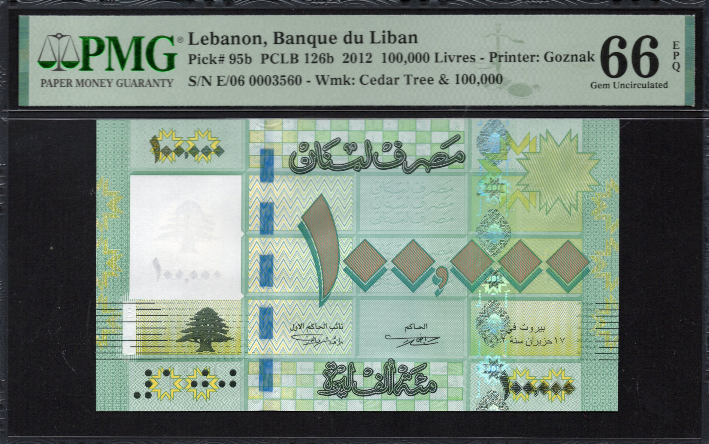 Lebanon - 100.000 Livres 2012 - Pick # 95b - PMG 66 EPQ