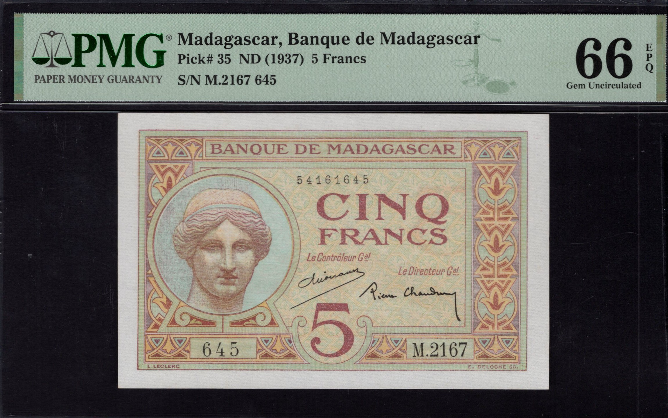 Madagascar - 5 Francs 1937 - Pick # 35 - PMG 66 EPQ