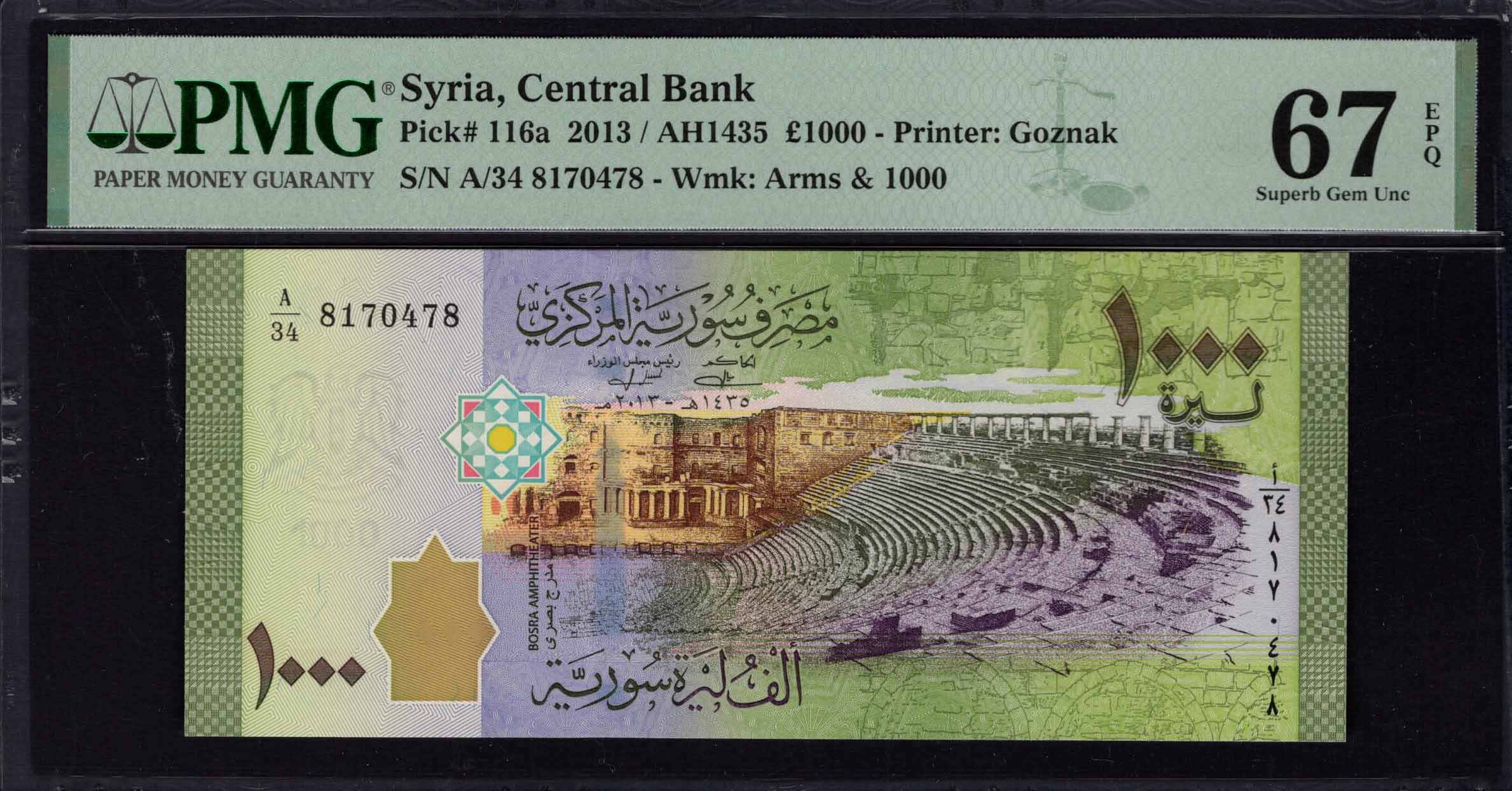 Syria - 1000 Pounds 2013 - Pick # 116a - PMG 67 EPQ