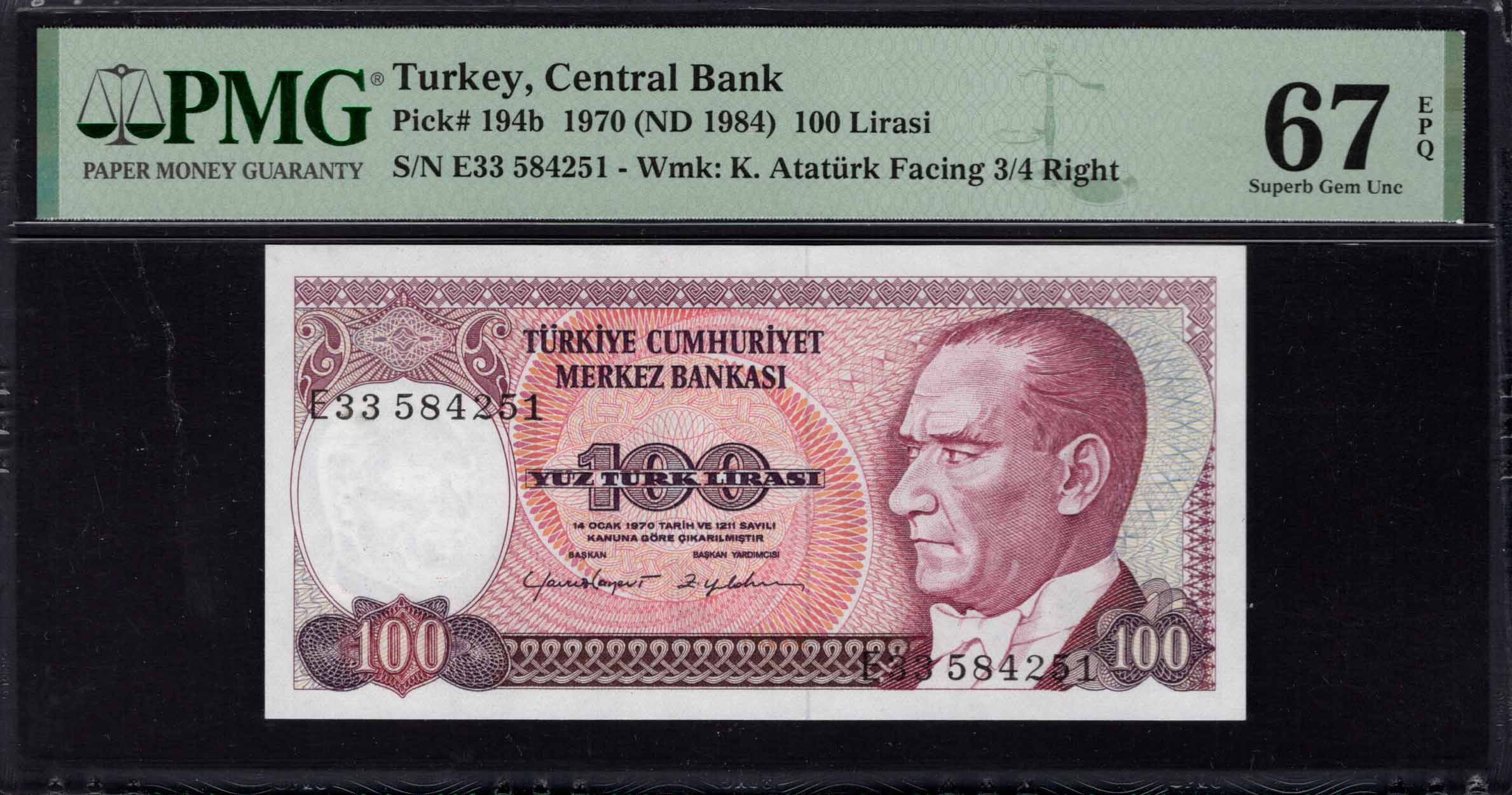 Turkey - 100 Lirasi 1970 - Pick # 194b - PMG 67 EPQ