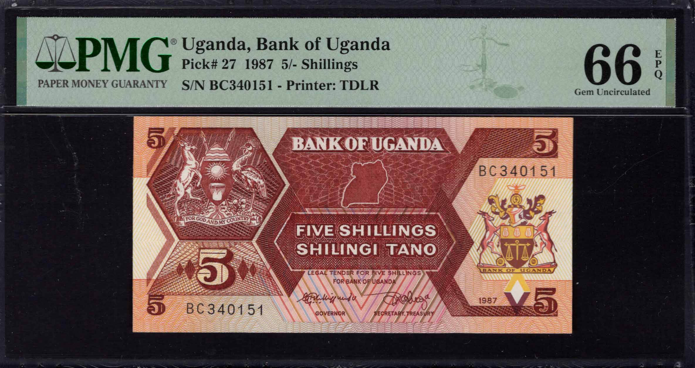 Uganda - 5 Shillings 1987 - Pick # 27 - PMG 66 EPQ