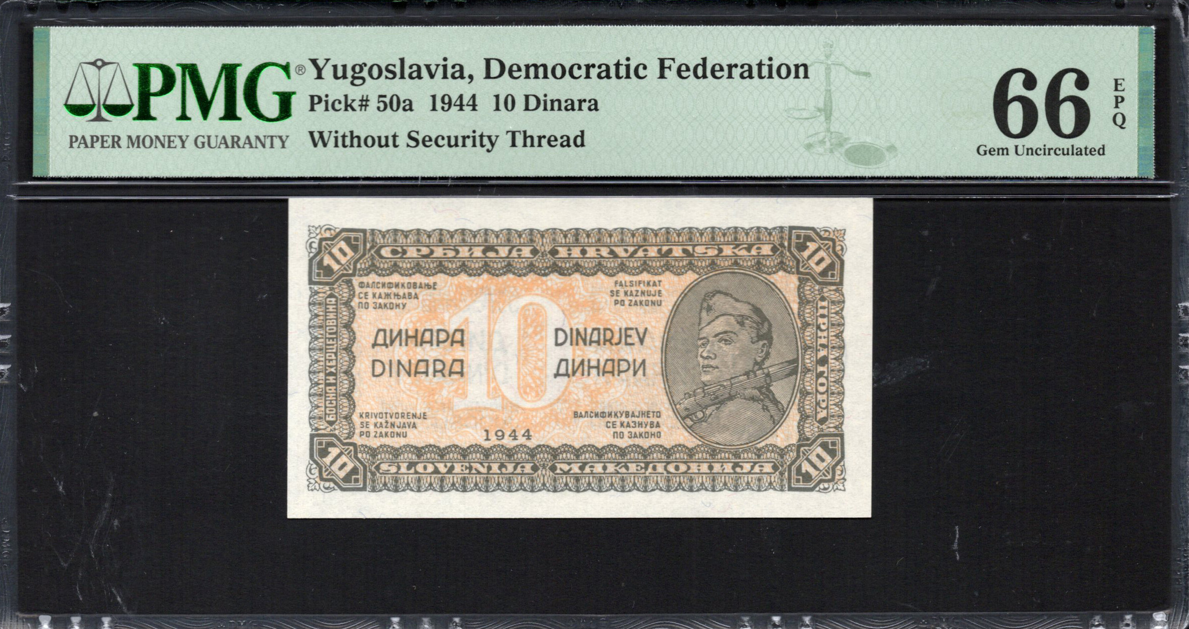 Yugoslavia - 10 Dinara 1944 - Pick # 50a - PMG 66 EPQ
