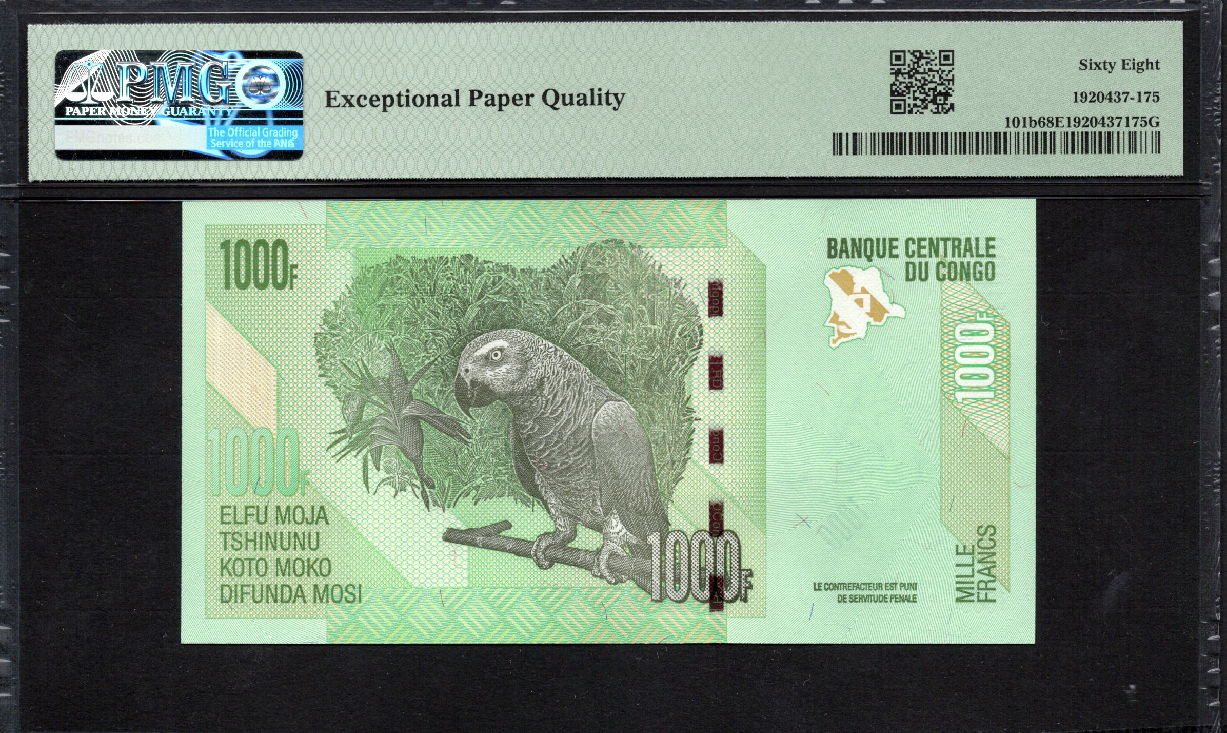 Le verso du billet présente des designs complexes avec des formes géométriques et une représentation artistique de l'habitat de l'okapi, contribuant au thème global de la conservation de la nature. L'affichage proéminent de la dénomination ‘1000 F’ est répété pour une identification facile, tandis que l'emblème central ajoute un élément de signification culturelle. De plus, diverses caractéristiques de sécurité sont intégrées dans le design, notamment une bande holographique et une encre changeante de couleur, qui jouent un rôle crucial dans la protection du billet contre la contrefaçon. La fusion harmonieuse de l'art et de la fonctionnalité caractérise ce billet comme une monnaie sécurisée et esthétiquement agréable.