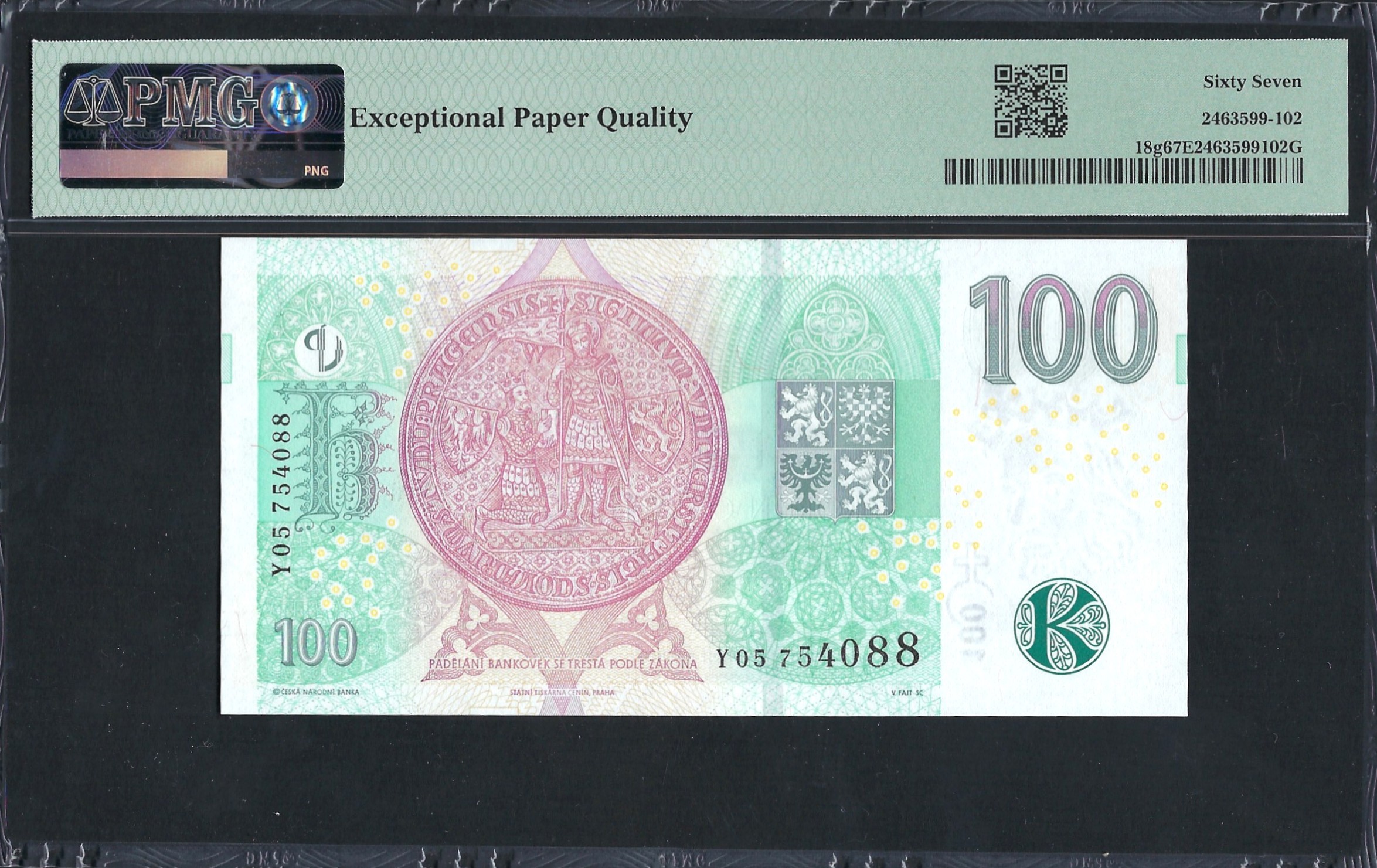 Le verso du billet de 100 Korun offre une gamme agréable de motifs et de couleurs. Il présente un design géométrique avec des lignes entrelacées et un dégradé de couleurs vives qui ajoute de l'intérêt visuel. La dénomination '100' apparaît de manière proéminente à nouveau, créant une cohérence dans le design. De plus, vous pouvez repérer des caractéristiques de sécurité comme une petite fenêtre transparente et de la micro-impression, essentielles pour prévenir la contrefaçon. La mise en page globale est conçue pour refléter l'identité culturelle de la République tchèque, faisant de ce billet une combinaison d'art et de praticité.