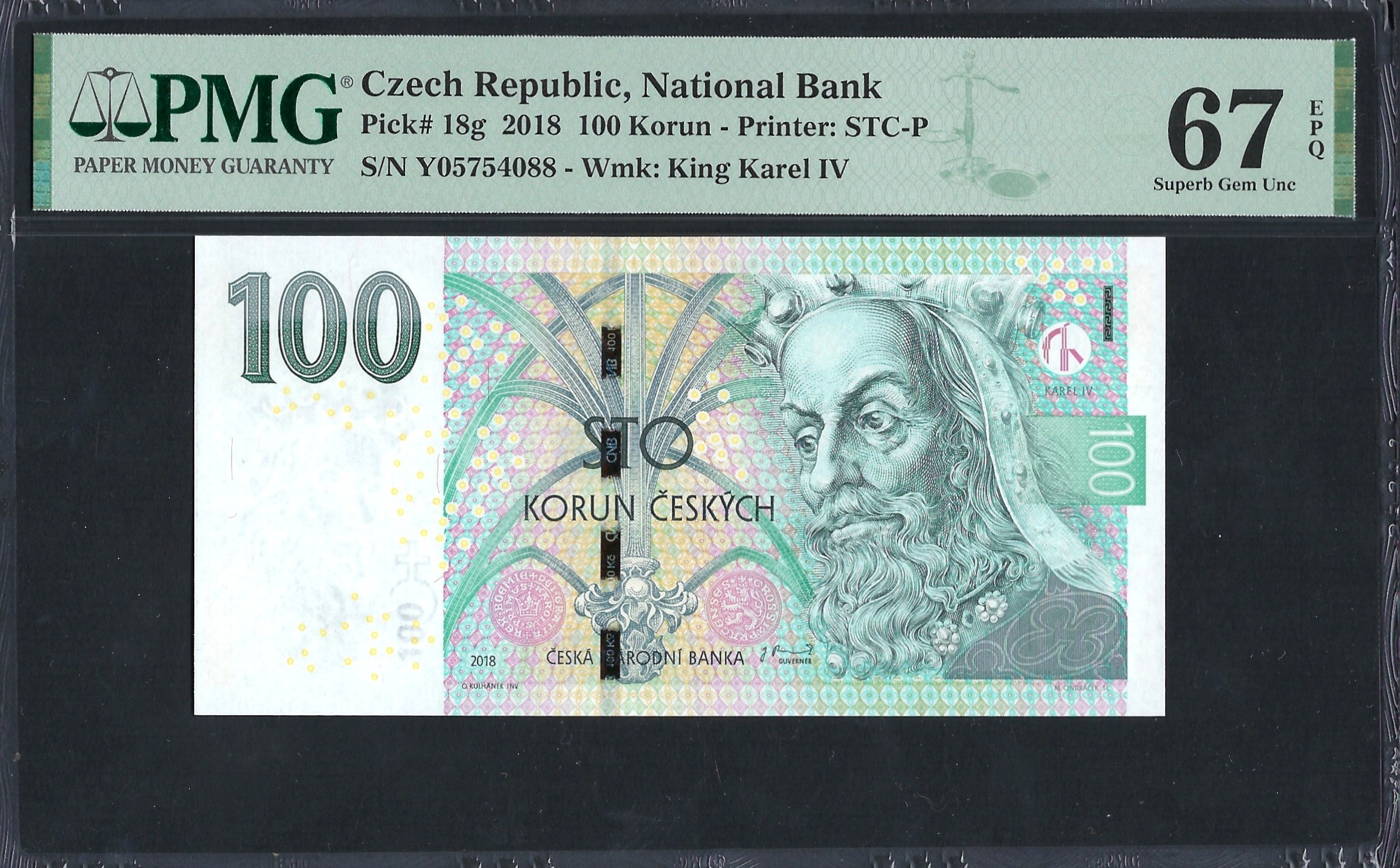 Le billet de 100 Korun de la République tchèque présente une riche combinaison d'éléments artistiques et de caractéristiques de sécurité. Un côté arbore un portrait du roi Charles IV, une figure historique notable, symbolisant le patrimoine et l'autorité. Les couleurs sont vives, principalement des nuances de vert, accentuées par des pastels qui créent un fond attrayant. Ce billet utilise des méthodes de sécurité avancées telles qu'un filigrane représentant le roi et de la micro-impression, renforçant son authenticité. Le revers présente des motifs et des symboles complexes, encapsulant des éléments culturels de la République tchèque et démontrant davantage la compétence du design monétaire.