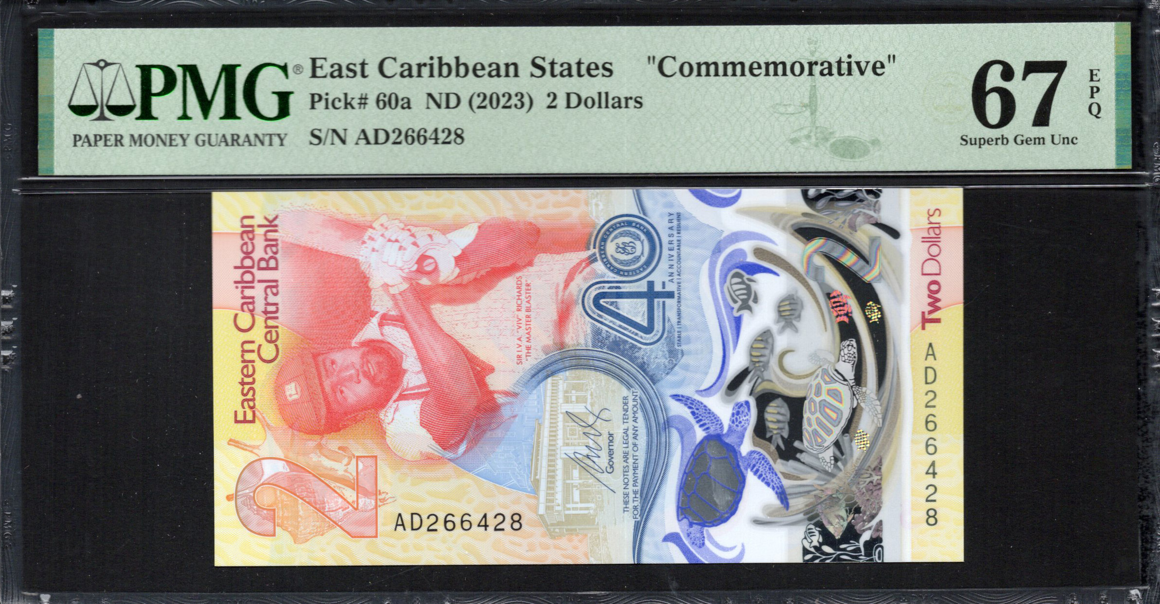 Le recto du billet présente clairement la dénomination '2 Dollars' en caractères gras, ce qui le rend facilement reconnaissable. Il met en scène un athlète pratiquant un sport local, symbolisant l'importance culturelle des sports dans les Caraïbes. L'arrière-plan est orné de couleurs chaudes, allant du jaune à l'orange, créant une esthétique vibrante. De plus, le billet incorpore des éléments de sécurité tels que des micro-impressions et une zone filigranée représentant des motifs complexes. L'utilisation de dégradés de couleurs renforce l'attrait visuel, tandis que des caractéristiques holographiques pourraient être présentes, contribuant à son authenticité.