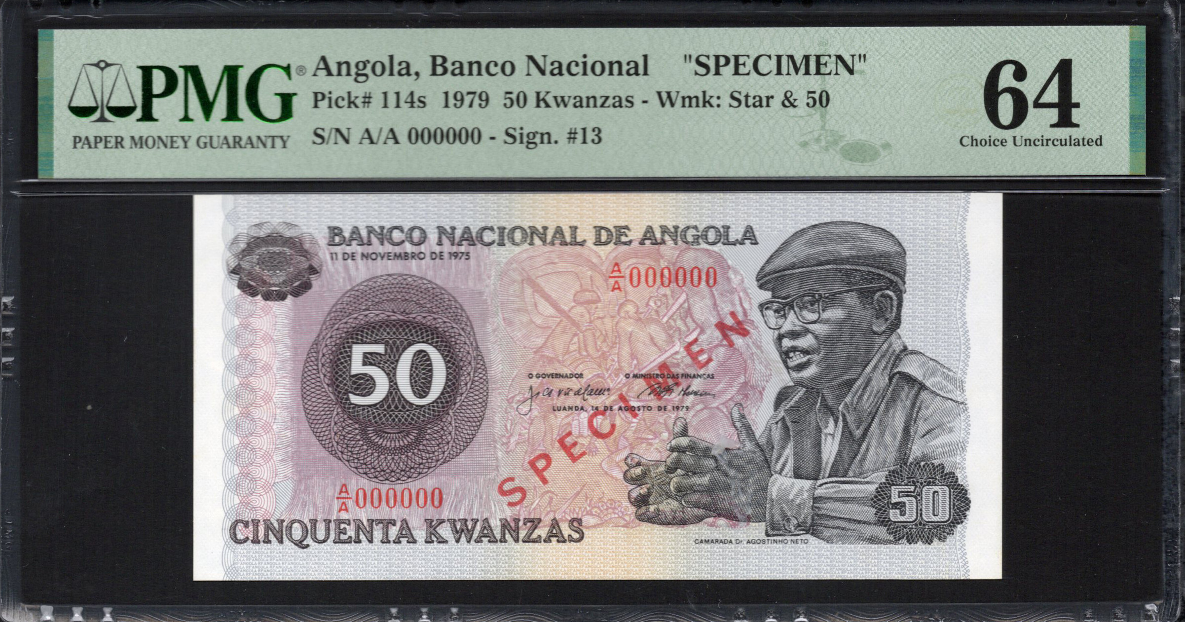 Le billet de 50 Kwanza d'Angola présente des designs distinctifs et des caractéristiques de sécurité, en faisant non seulement un moyen d'échange mais aussi une pièce d'art qui représente le patrimoine angolais. Émis par la Banco Nacional de Angola en 1979, cet exemplaire comprend des références historiques significatives. La palette de couleurs dominante mélange des teintes de rouge et de gris, avec des images proéminentes qui symbolisent les aspirations et les luttes de la nation. La présence du mot 'SPECIMEN' sur le billet indique son statut d'exemple non circulaire, utilisé principalement à des fins éducatives et d'exposition.