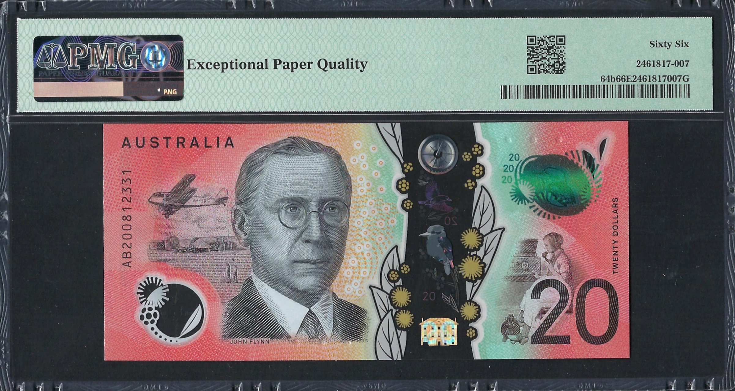Le recto du billet de 20 dollars présente en vedette le portrait de Mary Reibey, une figure notoire de l'histoire coloniale précoce de l'Australie. Autour de son image, on peut voir des motifs colorés, y compris la représentation d'un oiseau et des motifs floraux symbolisant l'environnement unique de l'Australie. On peut observer une fenêtre transparente avec des caractéristiques de sécurité, y compris un filigrane et une micro-impression pour prévenir la contrefaçon. Le dégradé de couleurs passe de l'orange au vert, ajoutant à l'attrait esthétique et à la complexité du billet.