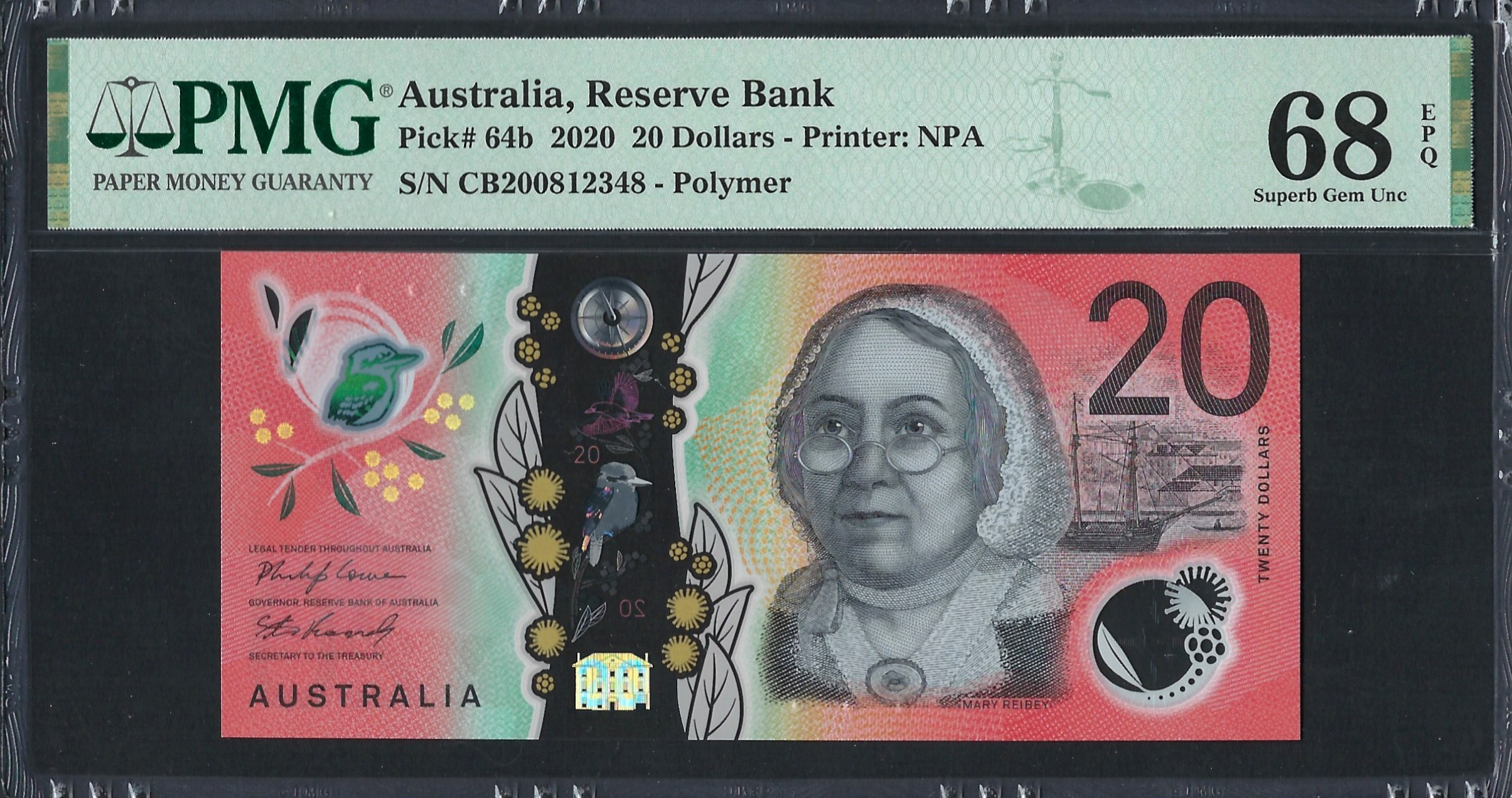 L'avers du billet de 20 dollars présente un design coloré incluant l'image de Mary Reibey, une figure historique significative de l'histoire coloniale précoce de l'Australie. Entourant son portrait se trouvent des fleurs vibrantes et une représentation d'un oiseau, mettant en avant la faune indigène de l'Australie. Le billet incorpore des caractéristiques de sécurité telles qu'une fenêtre transparente avec un élément holographique et une micro-impression pour empêcher la contrefaçon, ainsi que la dénomination clairement visible à divers emplacements.